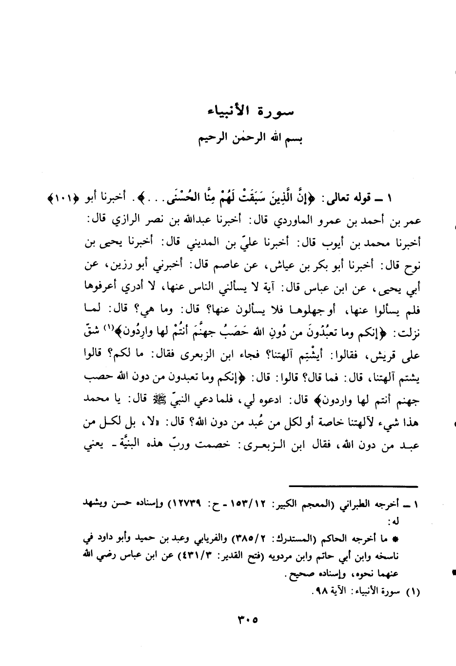 أَخْبَرَنَا أَبُو عُمَرَ بْنُ أَحْمَدَ بْنِ عَمْرٍو الْمَاوَرْدِيُّ قال: أخبرنا عَبْدُ اللَّهِ بْنُ نَصْرٍ الرَّازِيُّ قَالَ: أَخْبَرَنَا مُحَمَّدُ بْنُ أَيُّوبَ قَالَ: أَخْبَرَنَا عَلِيُّ بْنُ الْمَدِينِيِّ قَالَ: أَخْبَرَنَا يَحْيَى بْنُ نُوحٍ قَالَ: أَخْبَرَنَا أَبُو بَكْرِ بْنُ عَيَّاشٍ، عَنْ عَاصِمٍ قَالَ: أَخْبَرَنِي أَبُو رُزَيْنٍ، عَنْ أَبِي يَحْيَى، عَنِ ابْنِ عَبَّاسٍ قَالَ: آيَةٌ لَا يَسْأَلُنِي النَّاسُ عَنْهَا، لَا أَدْرِي أَعَرَفُوهَا فَلَمْ يَسْأَلُوا عَنْهَا، أَوْ جَهِلُوهَا فَلَا يَسْأَلُونَ عَنْهَا؟ قَالَ: وَمَا هِيَ؟ قَالَ: لَمَّا نَزَلَتْ: {إِنَّكُمْ وَمَا تَعْبُدُونَ مِنْ دُونِ اللَّهِ حَصَبُ جَهَنَّمَ أَنْتُمْ لَهَا وَارِدُونَ} (¬2) شَقَّ عَلَى قريش، فقالوا: أيشتم آلِهَتَنَا؟ فَجَاءَ ابْنُ الزِّبَعْرَى فَقَالَ: مَا لَكُمْ؟ قَالُوا يَشْتُمُ آلِهَتَنَا، قَالَ: فَمَا قَالَ؟ قَالُوا: قَالَ: {إِنَّكُمْ وَمَا تَعْبُدُونَ مِنْ دُونِ اللَّهِ حَصَبُ جَهَنَّمَ أَنْتُمْ لَهَا وَارِدُونَ} قَالَ: ادْعُوهُ لِي، فَلَمَّا دُعِيَ النَّبِيُّ - صَلَّى اللهُ عَلَيْهِ وَسَلَّمَ - قَالَ: يَا مُحَمَّدُ هَذَا شَيْءٌ لِآلِهَتِنَا خَاصَّةً أَوْ لِكُلِّ مَنْ عُبِدَ مِنْ دُونِ اللَّهِ؟ قَالَ: "لَا، بَلْ لِكُلِّ مَنْ عُبِدَ مِنْ دُونِ اللَّهِ، فَقَالَ ابْنُ الزِّبَعْرَى: خُصِمْتَ وَرَبِّ هَذِهِ الْبَنِيَّةِ - يَعْنِي