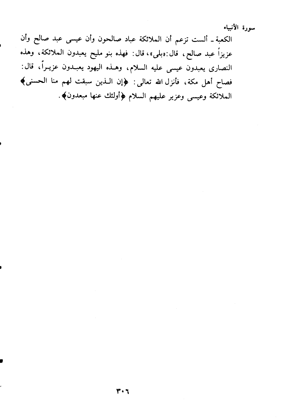 الْكَعْبَةَ - أَلَسْتَ تَزْعُمُ أَنَّ الْمَلَائِكَةَ عِبَادٌ صَالِحُونَ وَأَنَّ عِيسَى عَبْدٌ صَالِحٌ وَأَنَّ عُزَيْرًا عَبْدٌ صَالِحٌ، قَالَ: "بَلَى"، قَالَ: فَهَذِهِ بَنُو مَلِيحٍ يَعْبُدُونَ الْمَلَائِكَةَ، وَهَذِهِ النَّصَارَى يَعْبُدُونَ عِيسَى عَلَيْهِ السَّلَامُ، وَهَذِهِ الْيَهُودُ يَعْبُدُونَ عُزَيْرًا، قَالَ: فَصَاحَ أَهْلُ مَكَّةَ، فَأَنْزَلَ اللَّهُ تَعَالَى: {إِنَّ الَّذِينَ سَبَقَتْ لَهُمْ مِنَّا الْحُسْنَى} الْمَلَائِكَةُ