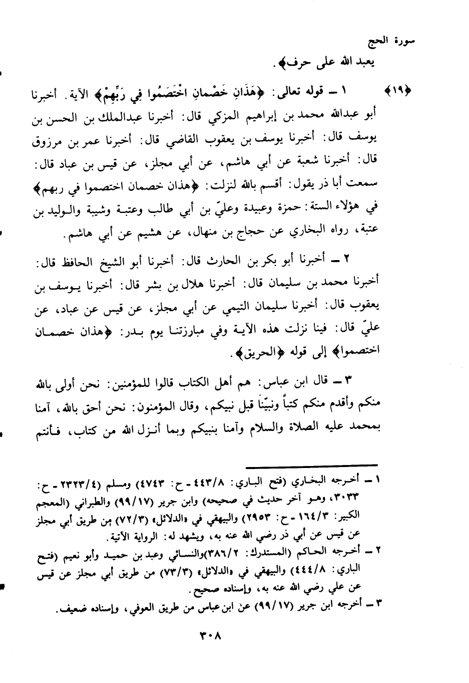 (¬2) - أَخْبَرَنَا أَبُو بَكْرِ بْنُ الْحَارِثِ قَالَ: أَخْبَرَنَا أَبُو الشَّيْخِ الْحَافِظُ قَالَ: أَخْبَرَنَا مُحَمَّدُ بْنُ سُلَيْمَانَ قَالَ: أَخْبَرَنَا هِلَالُ بْنُ بِشْرٍ قَالَ: أَخْبَرَنَا يُوسُفُ بْنُ يَعْقُوبَ قَالَ: أَخْبَرَنَا سُلَيْمَانُ التَّيْمِيُّ عَنْ أَبِي مِجْلَزٍ، عَنْ قيس عن عُبَادٍ، عَنْ عَلِيٍّ قَالَ: فِينَا نَزَلَتْ هَذِهِ الْآيَةُ وَفِي مُبَارَزَتِنَا يَوْمَ بَدْرٍ: {هَذَانِ خَصْمَانِ اخْتَصَمُوا} إِلَى قَوْلِهِ {الْحَرِيقِ}