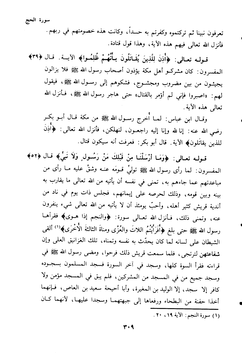 قَالَ الْمُفَسِّرُونَ: لَمَّا رَأَى رَسُولُ اللَّهِ - صَلَّى اللهُ عَلَيْهِ وَسَلَّمَ - تَوَلِّيَ قَوْمِهِ عَنْهُ وَشَقَّ عَلَيْهِ مَا رَأَى مِنْ مُبَاعَدَتِهِمْ عَمَّا جَاءَهُمْ بِهِ، تَمَنَّى فِي نَفْسِهِ أَنْ يَأْتِيَهُ مِنَ اللَّهِ تَعَالَى مَا يُقَارِبُ بِهِ بَيْنَهُ وَبَيْنَ قَوْمِهِ، وَذَلِكَ لِحِرْصِهِ عَلَى إِيمَانِهِمْ، فَجَلَسَ ذَاتَ يَوْمٍ فِي نَادٍ مِنْ أَنْدِيَةِ قُرَيْشٍ كَثِيرٍ أَهْلُهُ، وَأَحَبَّ يَوْمَئِذٍ أَنْ لَا يَأْتِيَهُ مِنَ اللَّهِ تَعَالَى شَيْءٌ يَنْفِرُونَ عَنْهُ، وَتَمَنَّى ذَلِكَ، فَأَنْزَلَ اللَّهُ تَعَالَى سُورَةَ: {وَالنَّجْمِ إِذَا هَوَى} فَقَرَأَهَا رَسُولُ اللَّهِ - صَلَّى اللهُ عَلَيْهِ وَسَلَّمَ - حَتَّى بَلَغَ {أَفَرَأَيْتُمُ اللَّاتَ وَالْعُزَّى وَمَنَاةَ الثَّالِثَةَ الْأُخْرَى} (¬1) أَلْقَى الشَّيْطَانُ عَلَى لِسَانِهِ لِمَا كَانَ يُحَدِّثُ بِهِ نَفْسَهُ وتمناه، تلك الغزانيق الْعُلَى وَإِنَّ شَفَاعَتَهُنَّ لَتُرْتَجَى، فَلَمَّا سَمِعَتْ قُرَيْشٌ ذَلِكَ فَرِحُوا، وَمَضَى رَسُولُ اللَّهِ - صَلَّى اللهُ عَلَيْهِ وَسَلَّمَ - فِي قراءته فقرأ السوة كُلَّهَا، وَسَجَدَ فِي آخِرِ السُّورَةِ فَسَجَدَ الْمُسْلِمُونَ بِسُجُودِهِ وَسَجَدَ جَمِيعُ مَنْ فِي الْمَسْجِدِ مِنَ الْمُشْرِكِينَ، فَلَمْ يَبْقَ فِي الْمَسْجِدِ مُؤْمِنٌ وَلَا كَافِرٌ إِلَّا سَجَدَ، إِلَّا الْوَلِيدَ بْنَ الْمُغِيرَةِ، وَأَبَا أُحَيْحَةَ سَعِيدَ بْنَ الْعَاصِ، فَإِنَّهُمَا أَخَذَا حَفْنَةً مِنَ الْبَطْحَاءِ وَرَفَعَاهَا إِلَى جَبْهَتِهِمَا