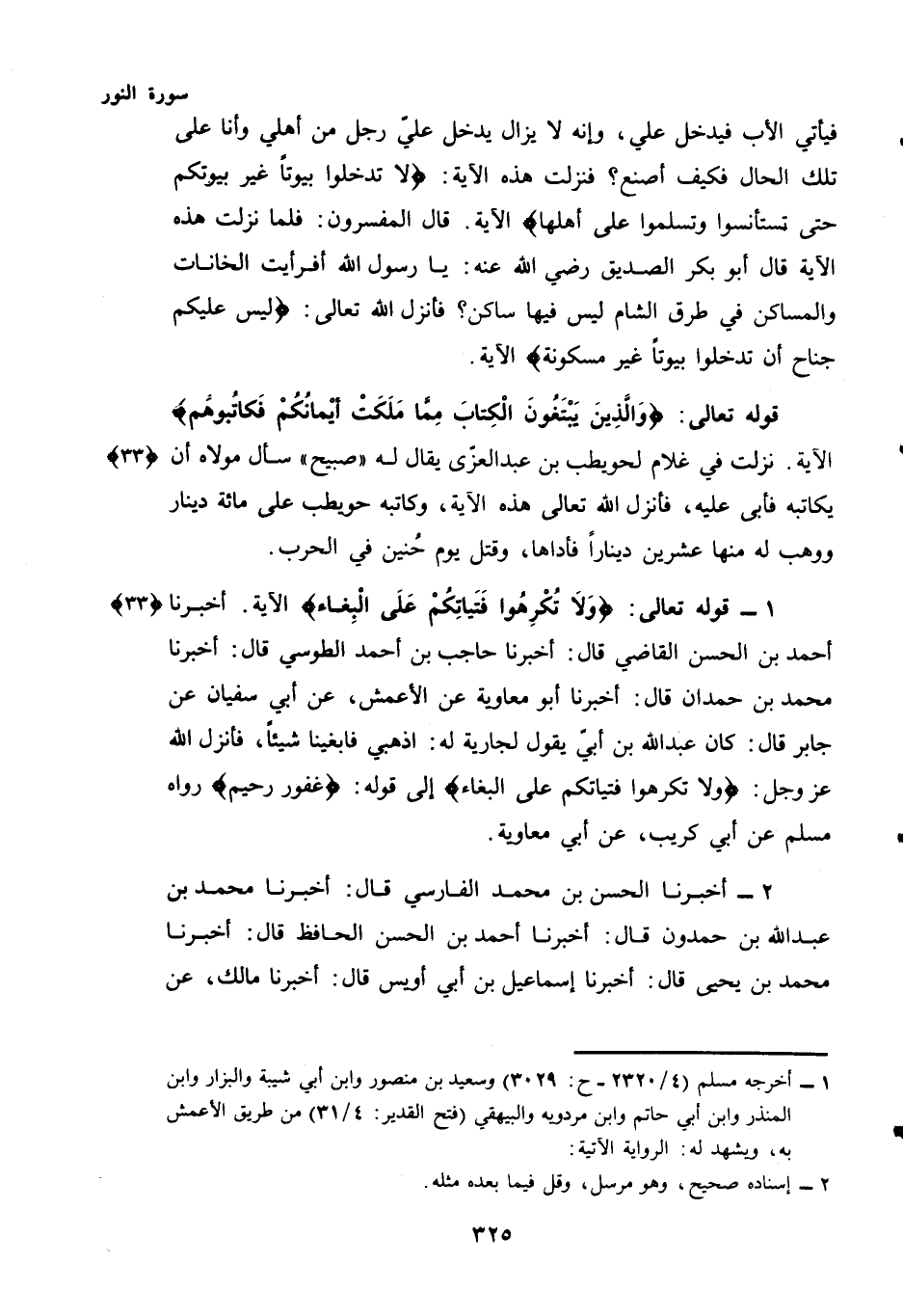 أَخْبَرَنَا أَحْمَدُ بْنُ الْحَسَنِ الْقَاضِي قَالَ: أَخْبَرَنَا حَاجِبُ بْنُ أَحْمَدَ الطوسي قال: أخبرنا مُحَمَّدُ بْنُ حمدان قال: أخبرنا أَبُو مُعَاوِيَةَ عَنِ الْأَعْمَشِ، عَنْ أَبِي سُفْيَانَ عَنْ جَابِرٍ قَالَ: كَانَ عَبْدُ اللَّهِ بْنُ أُبَيٍّ يَقُولُ لِجَارِيَةٍ لَهُ: اذْهَبِي فَابْغِينَا شَيْئًا، فَأَنْزَلَ اللَّهُ - عَزَّ وَجَلَّ - {وَلَا تُكْرِهُوا فَتَيَاتِكُمْ عَلَى الْبِغَاءِ} إِلَى قَوْلِهِ: {غَفُورٌ رَحِيمٌ} رَوَاهُ مُسْلِمٌ عَنْ أَبِي كُرَيْبٍ، عَنْ أَبِي مُعَاوِيَةَ.