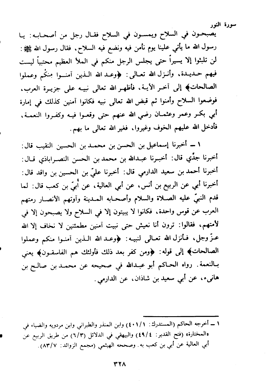 (¬1) - أَخْبَرَنَا إِسْمَاعِيلُ بْنُ الْحَسَنِ بْنِ مُحَمَّدِ بن الحسين النقيب قال: أخبرنا جدِّي قال: أخبرنا عبد الله بن محمد بْنِ الْحَسَنِ النصرأباذي قال: أخبرنا أَحْمَدُ بْنُ سَعِيدٍ الدارمي قال: أخبرنا عَلِيُّ بْنُ الْحُسَيْنِ بْنِ واقد قال: أخبرنا أَبِي عَنِ الرَّبِيعِ بْنِ أَنَسٍ، عَنْ أَبِي الْعَالِيَةِ، عَنْ أُبَيِّ بْنِ كعب قال: لما قدم النبيّ عليه الصلاة والسلام وَأَصْحَابُهُ الْمَدِينَةَ وَآوَتْهُمُ الْأَنْصَارُ رَمَتْهُمُ الْعَرَبُ عَنْ قَوْسٍ وَاحِدَةٍ، فَكَانُوا لَا يَبِيتُونَ إِلَّا فِي السِّلَاحِ وَلَا يصبحون إلا في لأمتهم، فقالوا: ترون أَنَّا نَعِيشُ حَتَّى نَبِيتَ آمِنِينَ مُطْمَئِنِّينَ لَا نَخَافُ إِلَّا اللَّهَ - عَزَّ وَجَلَّ - فَأَنْزَلَ اللَّهُ تَعَالَى لِنَبِيِّهِ: {وَعَدَ اللَّهُ الَّذِينَ آمَنُوا مِنْكُمْ وَعَمِلُوا الصَّالِحَاتِ} إِلَى قَوْلِهِ: {وَمَنْ كَفَرَ بَعْدَ ذَلِكَ فَأُولَئِكَ هُمُ الْفَاسِقُونَ} يَعْنِي بِالنِّعْمَةِ. رَوَاهُ الْحَاكِمُ أَبُو عَبْدِ اللَّهِ فِي صَحِيحِهِ عَنْ مُحَمَّدِ بْنِ صَالِحِ بْنِ هَانِئٍ، عَنْ أَبِي سَعِيدِ بْنِ شَاذَانَ، عَنِ الدَّارِمِيِّ.