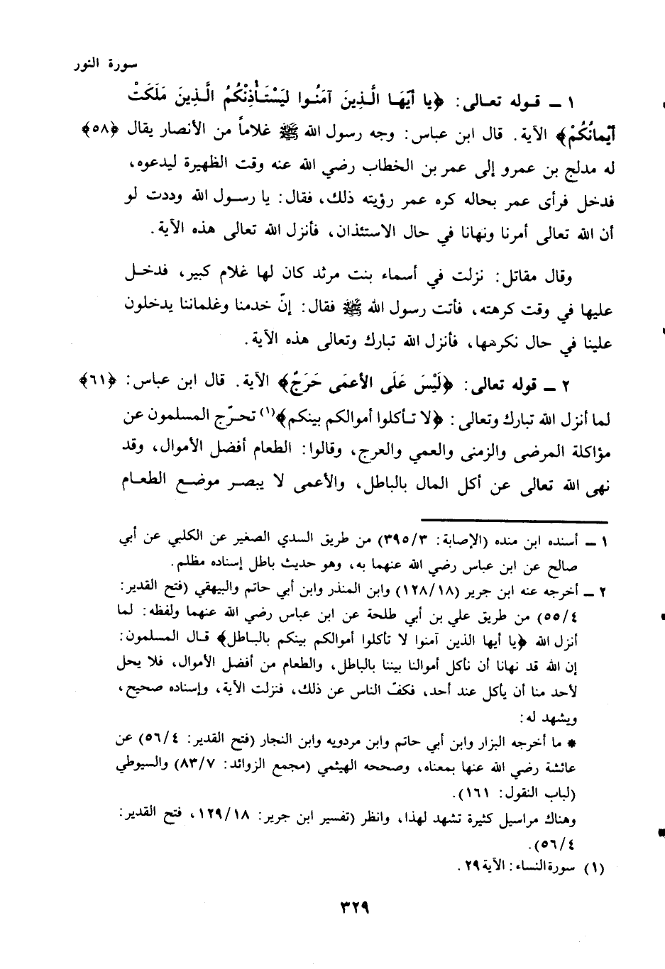 (¬2) - أخرجه عنه ابن جرير (18/128) وابن المنذر وابن أبي حاتم والبيهقي (فتح القدير: 4/55) من طريق علي بن أبي طلحة عن ابن عباس رضي الله عنهما ولفظه: لما أنزل الله "يا أيها الذين آمنوا لا تأكلوا أموالكم بينكم بالباطل" قال المسلمون: إن الله قد نهانا أن نأكل أموالنا بيننا بالباطل, والطعام من أفضل الأموال, فلا يحل لأحد منا أن يأكل عند أحد, فكف الناس عن ذلك, فنزلت الآية, إسناده صحيح, ويشهد له: