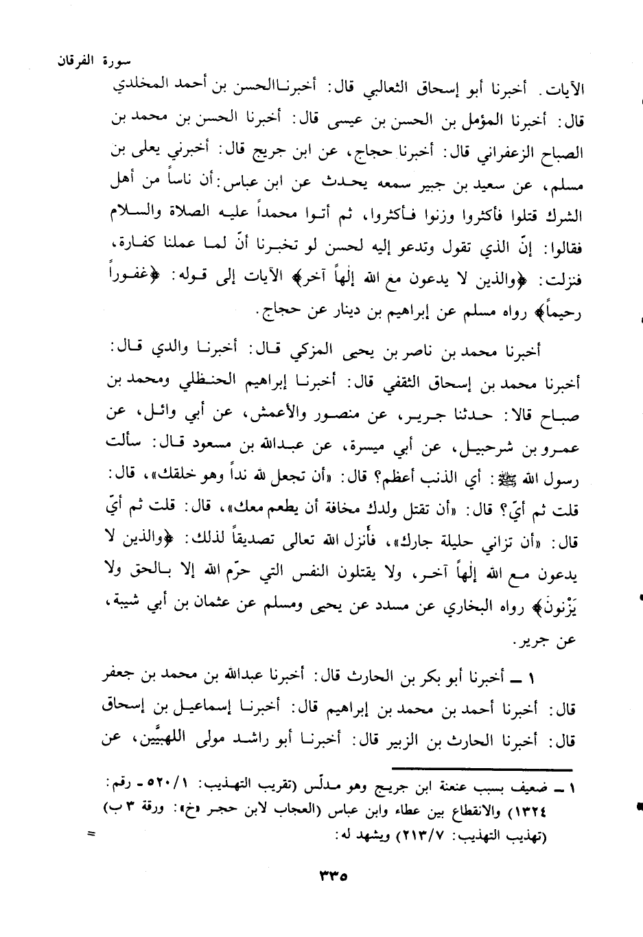 قَالَ: أَخْبَرَنَا الْمُؤَمَّلُ بْنُ الْحَسَنِ بْنِ عيسى قال: أخبرنا الْحَسَنُ بْنُ مُحَمَّدِ بْنِ الصَّبَّاحِ الزعفراني قال: أخبرنا حَجَّاجٌ، عَنِ ابْنِ جُرَيْجٍ قَالَ: أَخْبَرَنِي يَعْلَى بْنُ مُسْلِمٍ، عَنْ سَعِيدِ بْنِ جُبَيْرٍ سَمِعَهُ يُحَدِّثُ عَنِ ابْنِ عَبَّاسٍ: أَنَّ نَاسًا مِنْ أَهْلِ الشِّرْكِ قَتَلُوا فَأَكْثَرُوا وَزَنَوْا فَأَكْثَرُوا، ثُمَّ أتوا محمدًا عليه الصلاة والسلام فَقَالُوا: إِنَّ الَّذِي تَقُولُ وَتَدْعُو إِلَيْهِ لَحَسَنٌ لَوْ تُخْبِرُنَا أَنَّ لِمَا عَمِلْنَا كَفَّارَةً، فَنَزَلَتْ: {وَالَّذِينَ لَا يَدْعُونَ مَعَ اللَّهِ إِلَهًا آخَرَ} الْآيَاتِ إِلَى قَوْلِهِ: {غَفُورًا رَحِيمًا} رَوَاهُ مُسْلِمٌ عَنْ إِبْرَاهِيمَ بْنِ دِينَارٍ عَنْ حَجَّاجٍ.