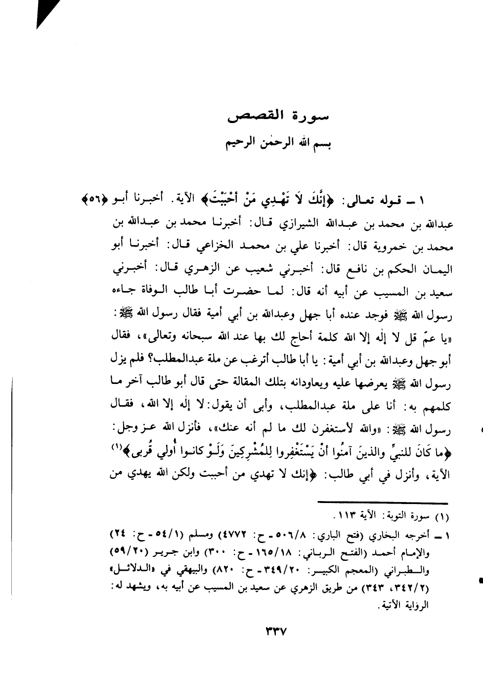 (¬1) - أخرجه البخاري (فتح الباري: 8/506 - ح: 4772) ومسلم (1/54 - ح: 24) والإمام أحمد (الفتح الرباني: 18/165 - ح: 300) وابن جرير (20/59) والطبراني (المعجم الكبير: 20/349 - ح: 820) والبيهقي في "الدلائل" (2/342, 343) من طريق الزهري عن سعيد بن المسيب عن أبيه به, ويشهد له: الرواية الآتية.