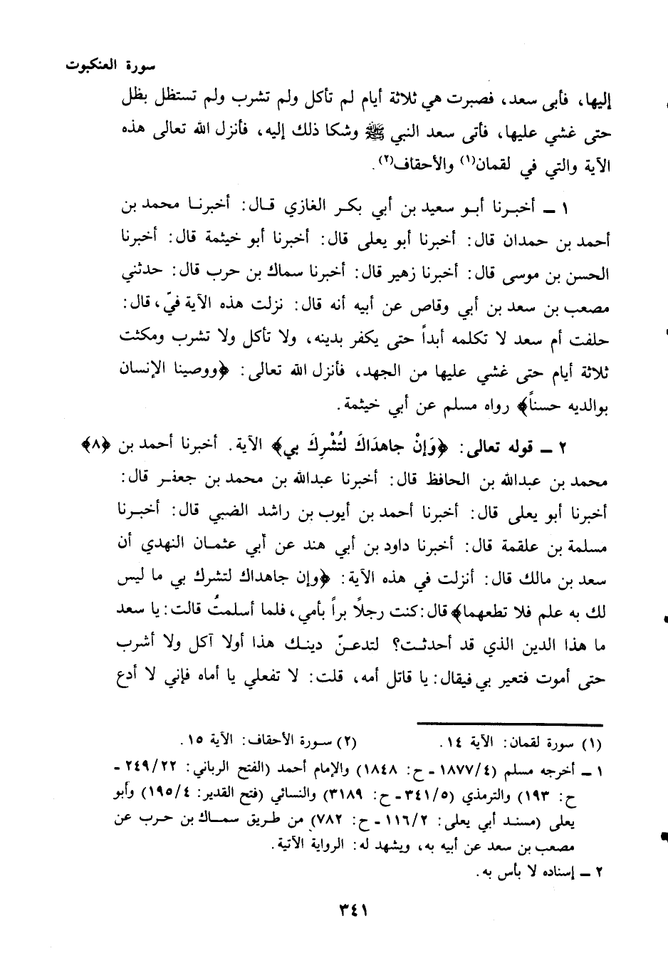 (¬3) - أَخْبَرَنَا أَبُو سَعِيدِ بْنُ أَبِي بَكْرٍ الْغَازِي قَالَ: أَخْبَرَنَا مُحَمَّدُ بْنُ أَحْمَدَ بْنِ حمدان قال: أخبرنا أَبُو يعلى قال: أخبرنا أَبُو خيثمة قال: أخبرنا الْحَسَنُ بْنُ موسى قال: أخبرنا زهير قال: أخبرنا سِمَاكُ بْنُ حَرْبٍ قَالَ: حَدَّثَنِي مُصْعَبُ بْنُ سَعْدِ بْنِ أَبِي وَقَّاصٍ عَنْ أَبِيهِ أَنَّهُ قَالَ: نَزَلَتْ هَذِهِ الْآيَةُ فِيَّ، قَالَ: حَلَفَتْ أُمُّ سَعْدٍ لَا تُكَلِّمُهُ أَبَدًا حَتَّى يَكْفُرَ بِدِينِهِ، وَلَا تَأْكُلُ وَلَا تَشْرَبُ وَمَكَثَتْ ثَلَاثَةَ أَيَّامٍ حَتَّى غُشِيَ عَلَيْهَا مِنَ الْجَهْدِ، فَأَنْزَلَ اللَّهُ تَعَالَى: {وَوَصَّيْنَا الْإِنْسَانَ بِوَالِدَيْهِ حُسْنًا} رَوَاهُ مُسْلِمٌ عَنْ أَبِي خَيْثَمَةَ.