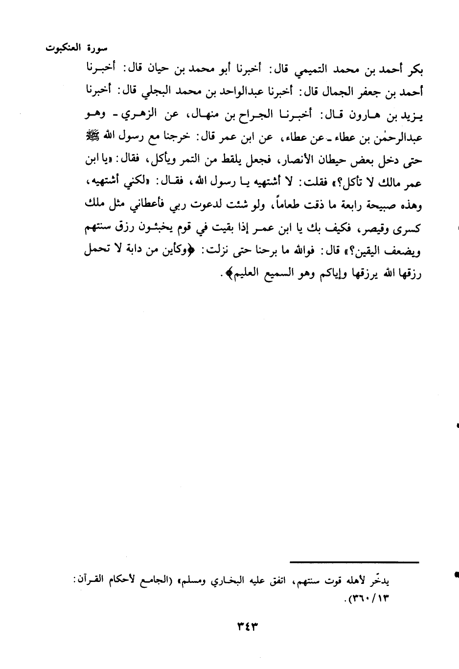 بَكْرٍ أَحْمَدُ بْنُ مُحَمَّدٍ التَّمِيمِيُّ قَالَ: أَخْبَرَنَا أَبُو مُحَمَّدِ بْنُ حيان قال: أخبرنا أَحْمَدُ بْنُ جَعْفَرٍ الجمال قال: أخبرنا عَبْدُ الْوَاحِدِ بْنُ مُحَمَّدٍ البجلي قال: أخبرنا يَزِيدُ بْنُ هارون قال: أخبرنا الجرّاح بْنُ مِنْهَالٍ، عَنِ الزُّهْرِيِّ - وَهُوَ عَبْدُ الرَّحْمَنِ بْنُ عَطَاءٍ - عَنْ عَطَاءٍ، عَنِ ابْنِ عُمَرَ قَالَ: خَرَجْنَا مَعَ رسول الله - صَلَّى اللهُ عَلَيْهِ وَسَلَّمَ - لا حَتَّى دَخَلَ بَعْضَ حِيطَانِ الْأَنْصَارِ، فَجَعَلَ يَلْقُطُ مِنَ التَّمْرِ وَيَأْكُلُ، فَقَالَ: "يَا ابن عمر مالك لَا تَأْكُلُ؟ " فَقُلْتُ: لَا أَشْتَهِيهِ يَا رَسُولَ اللَّهِ، فَقَالَ: "لَكِنِّي أَشْتَهِيهِ، وَهَذِهِ صبيحة رابعة ما ذقت طَعَامًا، وَلَوْ شِئْتُ لَدَعَوْتُ رَبِّي فَأَعْطَانِي مِثْلَ مُلْكِ كِسْرَى وَقَيْصَرَ، فَكَيْفَ بِكَ يَا ابْنَ عُمَرَ إِذَا بَقِيتَ فِي قَوْمٍ يَخْبَئُونَ رِزْقَ سَنَتِهِمْ وَيَضْعُفُ الْيَقِينُ؟ " قَالَ: فَوَاللَّهِ مَا بَرِحْنَا حَتَّى نَزَلَتْ: {وَكَأَيِّنْ مِنْ دَابَّةٍ لَا تَحْمِلُ رِزْقَهَا اللَّهُ يَرْزُقُهَا وَإِيَّاكُمْ وَهُوَ السَّمِيعُ الْعَلِيمُ} .