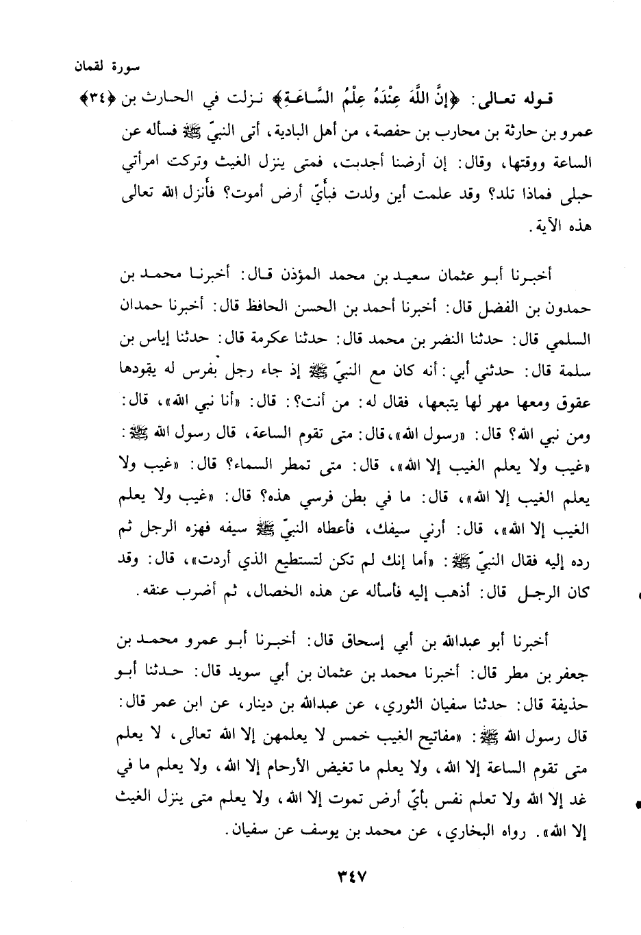نَزَلَتْ فِي الْحَارِثِ بْنِ عَمْرِو بْنِ حَارِثَةَ بْنِ مُحَارِبِ بْنِ حَفْصَةَ، مِنْ أَهْلِ الْبَادِيَةِ، أَتَى النَّبِيَّ - صَلَّى اللهُ عَلَيْهِ وَسَلَّمَ - فَسَأَلَهُ عَنِ السَّاعَةِ وَوَقْتِهَا، وَقَالَ: إِنَّ أَرْضَنَا أَجْدَبَتْ، فَمَتَى يَنْزِلُ الْغَيْثُ وَتَرَكْتُ امْرَأَتِي حُبْلَى فَمَاذَا تَلِدُ؟ وَقَدْ عَلِمْتُ أَيْنَ وُلِدْتُ فَبِأَيِّ أَرْضٍ أَمُوتُ؟ فَأَنْزَلَ اللَّهُ تَعَالَى هَذِهِ الْآيَةَ.