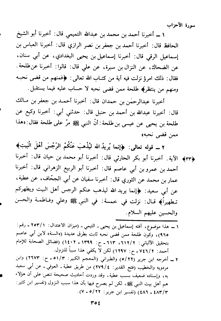 (¬2) - أخرجه ابن جرير (22/5) والطبراني (المعجم الكبير: 3/51 - ح: 2673) وابن مردويه والخطيب (فتح القدير: 4/279) من طريق عطية - العوفي - عن أبي سعيد به, وإسناده ضعيف بسبب عطية, وقد وردت أحاديث صحيحة تنص على أن هؤلاء هم أهل بيت النبي صَلَّى اللهُ عَلَيْهِ وَسَلَّمَ, لكن لم يصرح فيها بأن هذا سبب النزول (تفسير ابن كثير: 3/ 483 - 486) (تفسير ابن جرير: 22/5 - 7) .