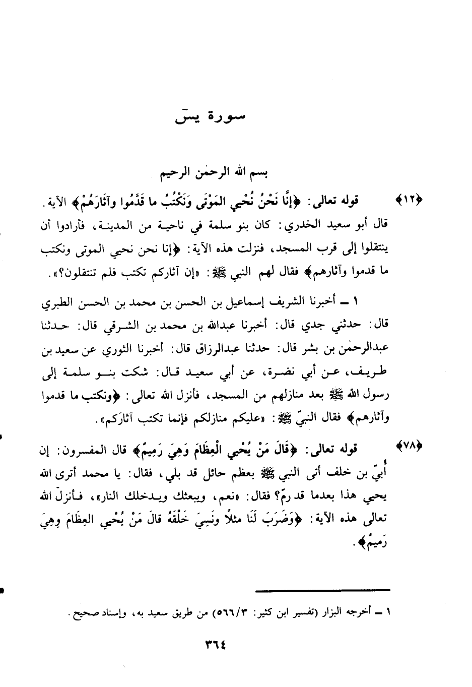 قَالَ أَبُو سَعِيدٍ الْخُدْرِيُّ: كَانَ بَنُو سَلِمَةَ فِي نَاحِيَةٍ مِنَ الْمَدِينَةِ، فَأَرَادُوا أَنْ يَنْتَقِلُوا إِلَى قُرْبِ الْمَسْجِدِ، فَنَزَلَتْ هَذِهِ الْآيَةُ: {إِنَّا نَحْنُ نُحْيِي الْمَوْتَى وَنَكْتُبُ مَا قَدَّمُوا وَآثَارَهُمْ} فَقَالَ لَهُمُ النَّبِيُّ - صَلَّى اللهُ عَلَيْهِ وَسَلَّمَ - "إِنَّ آثَارَكُمْ تُكْتَبُ فَلِمَ تَنْتَقِلُونَ؟ ".