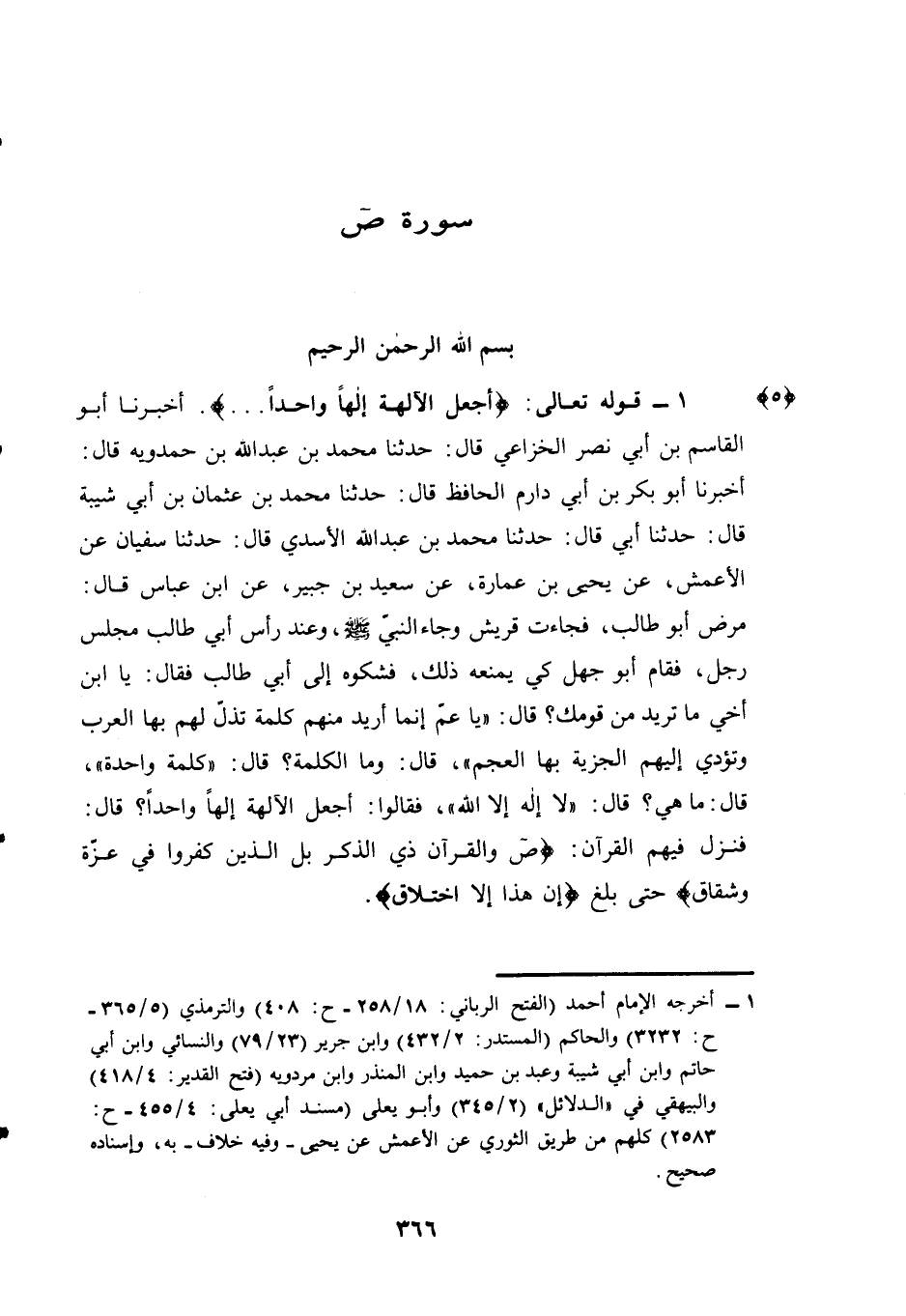 أَخْبَرَنَا أَبُو الْقَاسِمِ بْنُ أَبِي نَصْرٍ الْخُزَاعِيُّ قَالَ: حَدَّثَنَا مُحَمَّدُ بْنُ عَبْدِ اللَّهِ بْنِ حَمْدَوَيْهِ قَالَ: أَخْبَرَنَا أَبُو بَكْرِ بْنُ أَبِي دَارِمٍ الْحَافِظُ قَالَ: حَدَّثَنَا مُحَمَّدُ بْنُ عُثْمَانَ بْنِ أَبِي شَيْبَةَ قَالَ: حَدَّثَنَا أَبِي قَالَ: حَدَّثَنَا مُحَمَّدُ بْنُ عَبْدِ اللَّهِ الْأَسَدِيُّ قَالَ: حَدَّثَنَا سُفْيَانُ عَنِ الْأَعْمَشِ، عَنْ يَحْيَى بْنِ عُمَارَةَ، عَنْ سَعِيدِ بْنِ جُبَيْرٍ، عَنِ ابْنِ عَبَّاسٍ قَالَ: مَرِضَ أَبُو طَالِبٍ، فَجَاءَتْ قُرَيْشٌ وَجَاءَ النَّبِيُّ - صَلَّى اللهُ عَلَيْهِ وَسَلَّمَ - وَعِنْدَ رَأْسِ أَبِي طَالِبٍ مَجْلِسُ رَجُلٍ، فَقَامَ أَبُو جَهْلٍ كَيْ يَمْنَعَهُ ذَلِكَ، فَشَكَوْهُ إِلَى أَبِي طَالِبٍ فَقَالَ: يَا ابْنَ أَخِي مَا تُرِيدُ مِنْ قَوْمِكَ؟ قَالَ: "يَا عَمِّ إِنَّمَا أُرِيدَ مِنْهُمْ كَلِمَةً تَذِلُّ لَهُمْ بِهَا الْعَرَبُ وَتُؤَدِّي إِلَيْهِمُ الْجِزْيَةَ بِهَا الْعَجَمُ"، قَالَ: وَمَا الْكَلِمَةُ؟ قَالَ: "كَلِمَةٌ وَاحِدَةٌ"، قَالَ: مَا هِيَ؟ قَالَ: "لَا إِلَهَ إِلَّا اللَّهُ"، فَقَالُوا: أَجَعَلَ الْآلِهَةَ إِلَهًا وَاحِدًا؟ قَالَ: فَنَزَلَ فِيهِمُ الْقُرْآنُ: {ص وَالْقُرْآنِ ذِي الذِّكْرِ بَلِ الَّذِينَ كَفَرُوا فِي عِزَّةٍ وَشِقَاقٍ} حَتَّى بَلَغَ {إِنْ هَذَا إِلَّا اخْتِلَاقٌ}