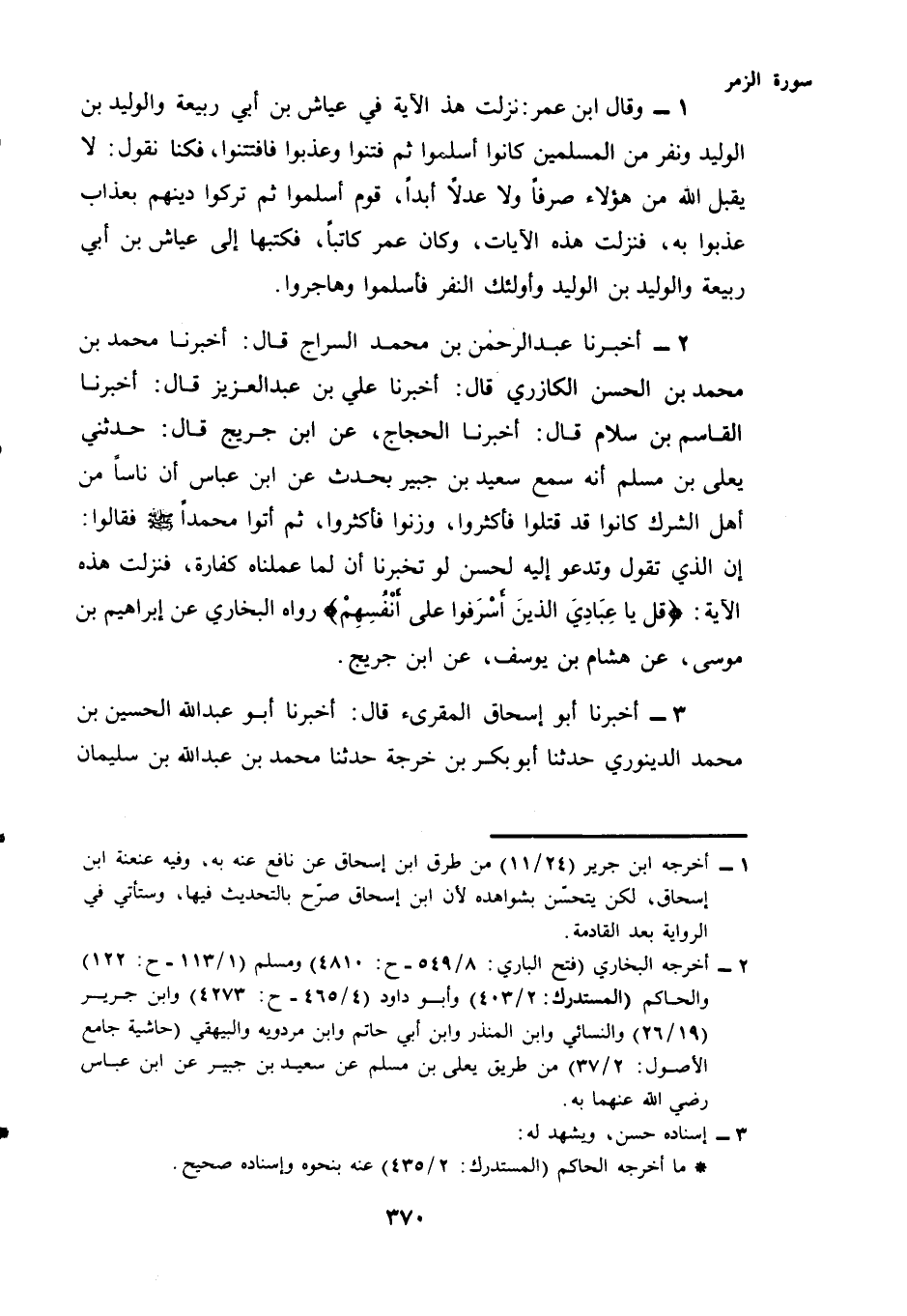 (¬2) - أَخْبَرَنَا عَبْدُ الرَّحْمَنِ بْنُ مُحَمَّدٍ السَّرَّاجُ قَالَ: أَخْبَرَنَا مُحَمَّدُ بْنُ مُحَمَّدِ بْنِ الْحَسَنِ الْكَازِرِيُّ قَالَ: أَخْبَرَنَا عَلِيُّ بْنُ عَبْدِ الْعَزِيزِ قَالَ: أَخْبَرَنَا الْقَاسِمُ بْنُ سلام قال: أخبرنا الْحَجَّاجُ، عَنِ ابْنِ جُرَيْجٍ قَالَ: حَدَّثَنِي يَعْلَى بْنُ مُسْلِمٍ أَنَّهُ سَمِعَ سَعِيدَ بن جبير بحدث عَنِ ابْنِ عَبَّاسٍ أَنَّ نَاسًا مِنْ أَهْلِ الشِّرْكِ كَانُوا قَدْ قَتَلُوا فَأَكْثَرُوا، وَزَنَوْا فَأَكْثَرُوا، ثُمَّ أَتَوْا مُحَمَّدًا - صَلَّى اللهُ عَلَيْهِ وَسَلَّمَ - فَقَالُوا: إِنَّ الَّذِي تَقُولُ وتدعو إِلَيْهِ لَحَسَنٌ لَوْ تُخْبِرُنَا أَنَّ لِمَا عَمِلْنَاهُ كَفَّارَةً، فَنَزَلَتْ هَذِهِ الآية: {قُلْ يَا عِبَادِيَ الَّذِينَ أَسْرَفُوا عَلَى أَنْفُسِهِمْ} رَوَاهُ الْبُخَارِيُّ عَنْ إِبْرَاهِيمَ بْنِ مُوسَى، عَنْ هِشَامِ بْنِ يُوسُفَ، عَنِ ابْنِ جُرَيْجٍ.