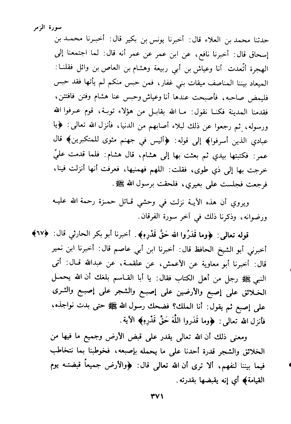 عُمَرَ أَنَّهُ قَالَ: لَمَّا اجْتَمَعْنَا إِلَى الْهِجْرَةِ اتَّعَدْتُ أَنَا وَعَيَّاشُ بْنُ أَبِي رَبِيعَةَ وَهِشَامُ بْنُ الْعَاصِ بْنِ وَائِلٍ فَقُلْنَا: الْمِيعَادُ بَيْنَنَا الْمُنَاصِفُ مِيقَاتُ بَنِي غِفَارٍ، فَمَنْ حُبِسَ مِنْكُمْ لَمْ يَأْتِهَا فَقَدْ حُبِسَ فَلْيَمْضِ صَاحِبُهُ، فَأَصْبَحْتُ عِنْدَهَا أَنَا وَعَيَّاشٌ وَحُبِسَ عَنَّا هِشَامٌ وَفُتِنَ فَافْتَتَنَ، فَقَدِمْنَا الْمَدِينَةَ فَكُنَّا نَقُولُ: مَا اللَّهُ بِقَابِلٍ مِنْ هَؤُلَاءِ تَوْبَةً، قَوْمٌ عَرَفُوا اللَّهَ وَرَسُولَهُ، ثُمَّ رَجَعُوا عَنْ ذَلِكَ لِبَلَاءٍ أَصَابَهُمْ مِنَ الدُّنْيَا، فَأَنْزَلَ الله تعالى: {يَا عِبَادِيَ الَّذِينَ أَسْرَفُوا} إِلَى قَوْلِهِ: {أَلَيْسَ فِي جَهَنَّمَ مَثْوًى لِلْمُتَكَبِّرِينَ} قَالَ عُمَرُ: فَكَتَبْتُهَا بِيَدِي ثُمَّ بَعَثْتُ بِهَا إِلَى هِشَامٍ، قَالَ هِشَامٌ: فَلَمَّا قَدِمَتْ عَلَيَّ خَرَجْتُ بِهَا إِلَى ذِي طُوًى، فَقُلْتُ: اللَّهُمَّ فَهِّمْنِيهَا، فَعَرَفْتُ أَنَّهَا أُنْزِلَتْ فِينَا، فَرَجَعْتُ فَجَلَسْتُ عَلَى بَعِيرِي، فَلَحِقْتُ بِرَسُولِ اللَّهِ - صَلَّى اللهُ عَلَيْهِ وَسَلَّمَ -.