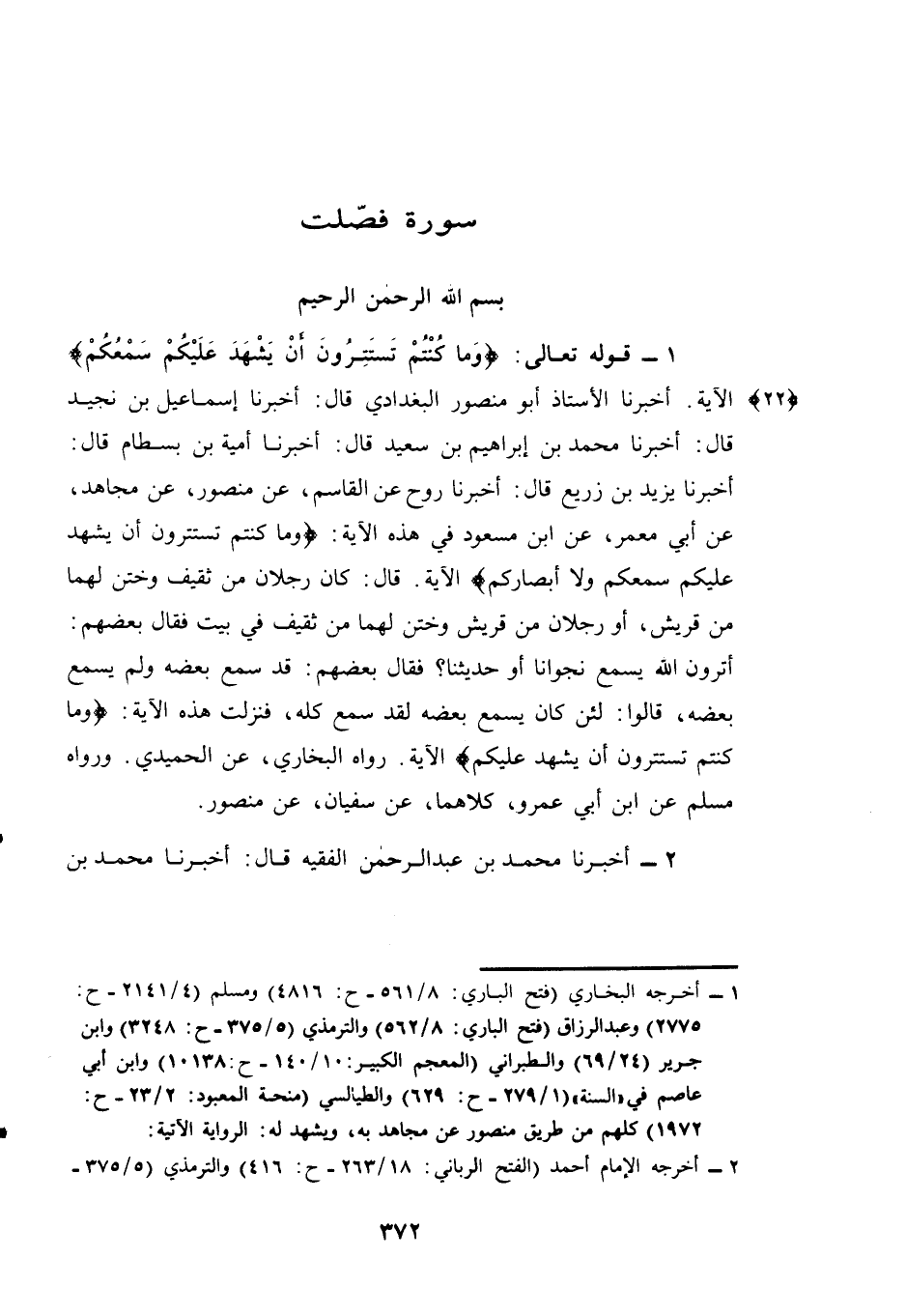 أَخْبَرَنَا الْأُسْتَاذُ أَبُو مَنْصُورٍ الْبَغْدَادِيُّ قَالَ: أَخْبَرَنَا إِسْمَاعِيلُ بْنُ نُجَيْدٍ قَالَ: أَخْبَرَنَا مُحَمَّدُ بْنُ إِبْرَاهِيمَ بْنِ سعيد قال: أخبرنا أُمَيَّةُ بْنُ بسطام قال: أخبرنا يَزِيدُ بْنُ زريع قال: أخبرنا رَوْحٌ عَنِ الْقَاسِمِ، عَنْ مَنْصُورٍ، عَنْ مُجَاهِدٍ، عَنْ أَبِي مَعْمَرٍ، عَنِ ابْنِ مَسْعُودٍ فِي هَذِهِ الْآيَةِ: {وَمَا كُنْتُمْ تَسْتَتِرُونَ أَنْ يَشْهَدَ عَلَيْكُمْ سَمْعُكُمْ وَلَا أَبْصَارُكُمْ} الْآيَةَ. قَالَ: كَانَ رَجُلَانِ مِنْ ثَقِيفٍ وَخَتَنٌ لَهُمَا مِنْ قُرَيْشٍ، أَوْ رَجُلَانِ مِنْ قُرَيْشٍ وَخَتَنٌ لَهُمَا مِنْ ثَقِيفٍ فِي بَيْتٍ فَقَالَ بَعْضُهُمْ: أَتَرَوْنَ اللَّهَ يَسْمَعُ نَجْوَانَا أَوْ حَدِيثَنَا؟ فَقَالَ بَعْضُهُمْ: قَدْ سَمِعَ بَعْضَهُ وَلَمْ يَسْمَعْ بَعْضَهُ، قَالُوا: لَئِنْ كَانَ يَسْمَعُ بَعْضَهُ لَقَدْ سَمِعَ كُلَّهُ، فَنَزَلَتْ هَذِهِ الْآيَةُ: {وَمَا كُنْتُمْ تَسْتَتِرُونَ أَنْ يَشْهَدَ عَلَيْكُمْ} الْآيَةَ. رَوَاهُ الْبُخَارِيُّ، عَنِ الْحُمَيْدِيِّ. وَرَوَاهُ مُسْلِمٌ عَنِ ابْنِ أَبِي عَمْرٍو، كِلَاهُمَا، عَنْ سُفْيَانَ، عَنْ مَنْصُورٍ.