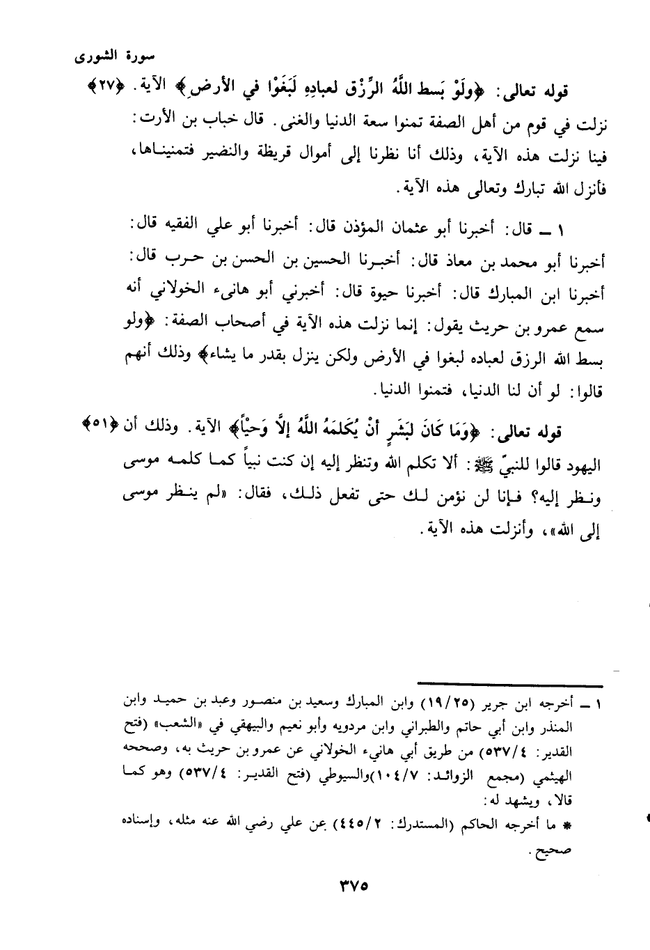 (¬1) - قَالَ: أخبرنا أَبُو عُثْمَانَ الْمُؤَذِّنُ قَالَ: أَخْبَرَنَا أَبُو عَلِيٍّ الْفَقِيهُ قَالَ: أَخْبَرَنَا أَبُو مُحَمَّدِ بْنُ مُعَاذٍ قَالَ: أَخْبَرَنَا الْحُسَيْنُ بْنُ الْحَسَنِ بْنِ حَرْبٍ قَالَ: أَخْبَرَنَا ابْنُ الْمُبَارَكِ قال: أخبرنا حيوة قال: أخبرني أَبُو هَانِئٍ الْخَوْلَانِيُّ أَنَّهُ سَمِعَ عَمْرَو بْنَ حُرَيْثٍ يَقُولُ: إِنَّمَا نَزَلَتْ هَذِهِ الْآيَةُ فِي أَصْحَابِ الصُّفَّةِ: {وَلَوْ بَسَطَ اللَّهُ الرِّزْقَ لِعِبَادِهِ لَبَغَوْا فِي الْأَرْضِ وَلَكِنْ يُنَزِّلُ بِقَدَرٍ مَا يَشَاءُ} وَذَلِكَ أَنَّهُمْ قَالُوا: لَوْ أَنَّ لَنَا الدُّنْيَا، فَتَمَنَّوُا الدُّنْيَا.