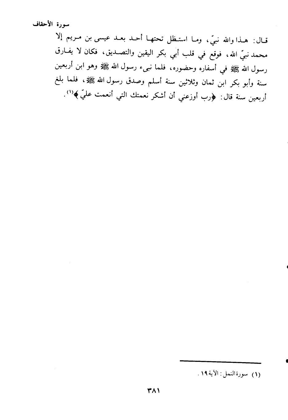 قَالَ: هَذَا وَاللَّهِ نَبِيٌّ، وَمَا اسْتَظَلَّ تَحْتَهَا أَحَدٌ بَعْدَ عِيسَى بْنِ مَرْيَمَ إِلَّا مُحَمَّدٌ نَبِيُّ اللَّهِ، فَوَقَعَ فِي قَلْبِ أَبِي بَكْرٍ الْيَقِينُ وَالتَّصْدِيقُ، فَكَانَ لَا يُفَارِقُ رَسُولَ اللَّهِ - صَلَّى اللهُ عَلَيْهِ وَسَلَّمَ - فِي أَسْفَارِهِ وَحُضُورِهِ، فَلَمَّا نُبِّئَ رَسُولُ اللَّهِ - صَلَّى اللهُ عَلَيْهِ وَسَلَّمَ - وَهُوَ ابْنُ أَرْبَعِينَ سَنَةً وَأَبُو بَكْرٍ ابْنُ ثَمَانٍ وَثَلَاثِينَ سَنَةً أَسْلَمَ وَصَدَّقَ رَسُولَ اللَّهِ - صَلَّى اللهُ عَلَيْهِ وَسَلَّمَ - فَلَمَّا بَلَغَ أَرْبَعِينَ سَنَةً قَالَ: {رَبِّ أَوْزِعْنِي أَنْ