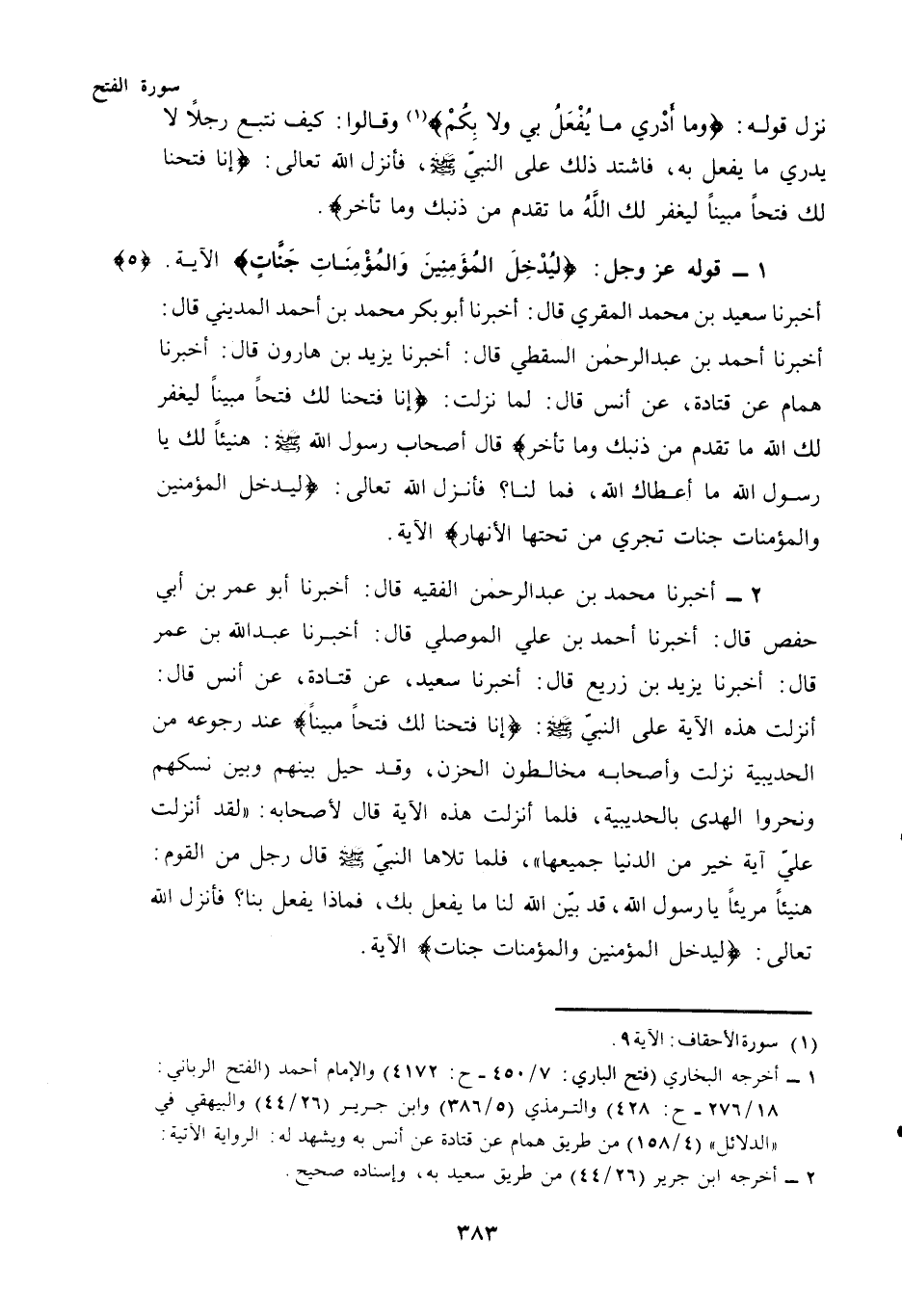 (¬3) - أَخْبَرَنَا مُحَمَّدُ بْنُ عَبْدِ الرَّحْمَنِ الْفَقِيهُ قَالَ: أَخْبَرَنَا أَبُو عُمَرَ بْنُ أَبِي حَفْصٍ قَالَ: أَخْبَرَنَا أَحْمَدُ بْنُ عَلِيٍّ الموصلي قال: أخبرنا عَبْدُ اللَّهِ بْنُ عمر قال: أخبرنا يَزِيدُ بْنُ زريع قال: أخبرنا سَعِيدٌ، عَنْ قَتَادَةَ، عَنْ أنس قال: أنزلت هَذِهِ الْآيَةُ عَلَى النَّبِيِّ - صَلَّى اللهُ عَلَيْهِ وَسَلَّمَ - {إِنَّا فَتَحْنَا لَكَ فَتْحًا مُبِينًا} عِنْدَ رُجُوعِهِ مِنَ الْحُدَيْبِيَةِ نَزَلَتْ وَأَصْحَابُهُ مُخَالِطُونَ الْحُزْنَ، وَقَدْ حِيلَ بَيْنَهُمْ وَبَيْنَ نُسُكِهِمْ وَنَحَرُوا الْهَدْيَ بِالْحُدَيْبِيَةِ، فَلَمَّا أُنْزِلَتْ هَذِهِ الْآيَةُ قَالَ لِأَصْحَابِهِ: "لَقَدْ أُنْزِلَتْ عَلَيَّ آيَةٌ خَيْرٌ مِنَ الدُّنْيَا جَمِيعِهَا"، فَلَمَّا تَلَاهَا النَّبِيُّ - صَلَّى اللهُ عَلَيْهِ وَسَلَّمَ - قَالَ رَجُلٌ مِنَ الْقَوْمِ: هَنِيئًا مَرِيئًا يَا رَسُولَ اللَّهِ، قَدْ بَيَّنَ اللَّهُ لَنَا مَا يَفْعَلُ بِكَ، فَمَاذَا يَفْعَلُ بِنَا؟ فَأَنْزَلَ اللَّهُ تَعَالَى: {لِيُدْخِلَ الْمُؤْمِنِينَ وَالْمُؤْمِنَاتِ جَنَّاتٍ} الْآيَةَ.