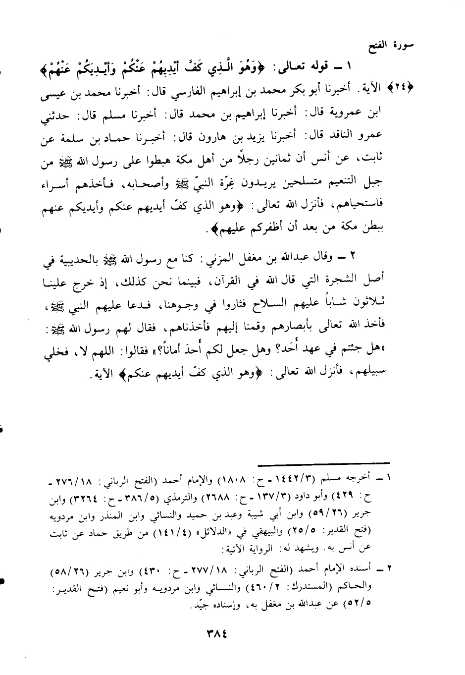 أَخْبَرَنَا أَبُو بَكْرٍ مُحَمَّدُ بْنُ إِبْرَاهِيمَ الْفَارِسِيُّ قَالَ: أَخْبَرَنَا مُحَمَّدُ بْنُ عِيسَى بْنِ عَمْرَوَيْهِ قَالَ: أَخْبَرَنَا إِبْرَاهِيمُ بْنُ مُحَمَّدٍ قَالَ: أَخْبَرَنَا مُسْلِمٌ قَالَ: حَدَّثَنِي عَمْرٌو النَّاقِدُ قال: أخبرنا يَزِيدُ بْنُ هَارُونَ قَالَ: أَخْبَرَنَا حَمَّادُ بْنُ سَلَمَةَ عَنْ ثَابِتٍ، عَنْ أَنَسٍ أَنَّ ثَمَانِينَ رَجُلًا مِنْ أَهْلِ مَكَّةَ هَبَطُوا عَلَى رَسُولِ اللَّهِ - صَلَّى اللهُ عَلَيْهِ وَسَلَّمَ - مِنْ جَبَلِ التَّنْعِيمِ مُتَسَلِّحِينَ يُرِيدُونَ غِرَّةَ النَّبِيِّ - صَلَّى اللهُ عَلَيْهِ وَسَلَّمَ - وَأَصْحَابِهِ، فَأَخَذَهُمْ أُسَرَاءَ فَاسْتَحْيَاهُمْ، فَأَنْزَلَ اللَّهُ تَعَالَى: {وَهُوَ الَّذِي كَفَّ أَيْدِيَهُمْ عَنْكُمْ وَأَيْدِيَكُمْ عَنْهُمْ بِبَطْنِ مَكَّةَ مِنْ بَعْدِ أَنْ أَظْفَرَكُمْ عَلَيْهِمْ}