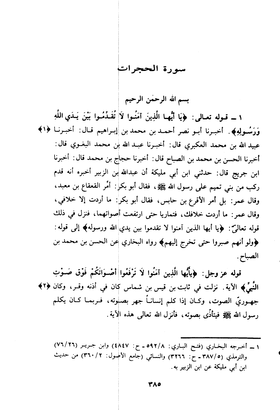 أَخْبَرَنَا أَبُو نَصْرٍ أَحْمَدُ بْنُ مُحَمَّدِ بْنِ إِبْرَاهِيمَ قَالَ: أَخْبَرَنَا عُبَيْدُ اللَّهِ بْنُ مُحَمَّدٍ الْعُكْبَرِيُّ قَالَ: أَخْبَرَنَا عَبْدُ اللَّهِ بْنُ مُحَمَّدٍ الْبَغَوِيُّ قال: أخبرنا الْحَسَنُ بْنُ مُحَمَّدِ بْنِ الصَّبَّاحِ قال: أخبرنا حَجَّاجُ بْنُ مُحَمَّدٍ قَالَ: أَخْبَرَنَا ابْنُ جُرَيْجٍ قَالَ: حَدَّثَنِي ابْنُ أَبِي مُلَيْكَةَ أَنَّ عَبْدَ اللَّهِ بْنَ الزُّبَيْرِ أَخْبَرَهُ أَنَّهُ قَدِمَ رَكْبٌ مِنْ بَنِي تَمِيمٍ عَلَى رَسُولِ اللَّهِ - صَلَّى اللهُ عَلَيْهِ وَسَلَّمَ - فَقَالَ أَبُو بَكْرٍ: أَمِّرِ الْقَعْقَاعَ بْنَ مَعْبَدٍ، وَقَالَ عُمَرُ: بَلْ أَمِّرِ الْأَقْرَعَ بْنَ حَابِسٍ، فَقَالَ أَبُو بَكْرٍ: مَا أَرَدْتَ إِلَّا خِلَافِي، وَقَالَ عُمَرُ: مَا أَرَدْتُ خِلَافَكَ، فَتَمَارَيَا حَتَّى ارْتَفَعَتْ أَصْوَاتُهُمَا، فَنَزَلَ فِي ذَلِكَ قوله تعالى: {يَا أَيُّهَا الَّذِينَ آمَنُوا لَا تُقَدِّمُوا بَيْنَ يَدَيِ اللَّهِ وَرَسُولِهِ} إِلَى قَوْلِهِ: {وَلَوْ أَنَّهُمْ صَبَرُوا حَتَّى تَخْرُجَ إِلَيْهِمْ} رَوَاهُ الْبُخَارِيُّ عَنِ الْحَسَنِ بْنِ مُحَمَّدِ بْنِ الصَّبَّاحِ.