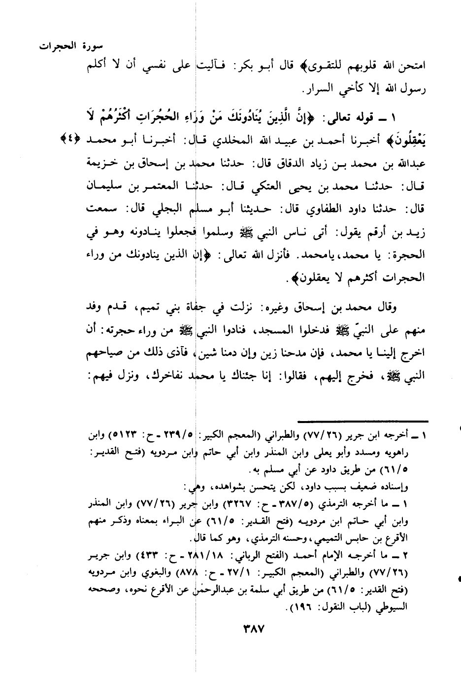 أَخْبَرَنَا أَحْمَدُ بْنُ عُبَيْدِ اللَّهِ الْمَخْلَدِيُّ قَالَ: أَخْبَرَنَا أَبُو مُحَمَّدٍ عَبْدُ اللَّهِ بْنُ مُحَمَّدِ بْنِ زِيَادٍ الدَّقَّاقُ قَالَ: حَدَّثَنَا مُحَمَّدُ بْنُ إِسْحَاقَ بْنِ خُزَيْمَةَ قَالَ: حَدَّثَنَا مُحَمَّدُ بْنُ يَحْيَى الْعَتَكِيُّ قَالَ: حَدَّثَنَا الْمُعْتَمِرُ بْنُ سُلَيْمَانَ قَالَ: حَدَّثَنَا دَاوُدُ الطفاوي قال: حديثنا أَبُو مُسْلِمٍ الْبَجَلِيُّ قَالَ: سَمِعْتُ زَيْدَ بْنَ أَرْقَمَ يَقُولُ: أَتَى نَاسٌ النَّبِيَّ - صَلَّى اللهُ عَلَيْهِ وَسَلَّمَ - وَسَلَّمُوا فَجَعَلُوا يُنَادُونَهُ وَهُوَ فِي الْحُجْرَةِ: يَا مُحَمَّدُ، يَا مُحَمَّدُ. فَأَنْزَلَ اللَّهُ تَعَالَى: {إِنَّ الَّذِينَ يُنَادُونَكَ مِنْ وَرَاءِ الْحُجُرَاتِ أَكْثَرُهُمْ لَا يَعْقِلُونَ} وَقَالَ مُحَمَّدُ بْنُ إِسْحَاقَ وَغَيْرُهُ: نَزَلَتْ فِي جُفَاةِ بَنِي تَمِيمٍ، قَدِمَ وَفْدٌ مِنْهُمْ عَلَى النَّبِيِّ - صَلَّى اللهُ عَلَيْهِ وَسَلَّمَ - فَدَخَلُوا الْمَسْجِدَ، فَنَادَوُا النَّبِيَّ - صَلَّى اللهُ عَلَيْهِ وَسَلَّمَ - مِنْ وَرَاءِ حُجُرَتِهِ: أَنِ اخْرُجْ إِلَيْنَا يَا مُحَمَّدُ، فَإِنَّ مَدْحَنَا زَيْنٌ وَإِنَّ ذَمَّنَا شَيْنٌ، فَآذَى ذَلِكَ مِنْ صِيَاحِهِمُ النَّبِيَّ - صَلَّى اللهُ عَلَيْهِ وَسَلَّمَ - فَخَرَجَ إِلَيْهِمْ، فَقَالُوا: إِنَّا جِئْنَاكَ يَا مُحَمَّدُ نُفَاخِرُكَ، وَنَزَلَ فِيهِمْ: