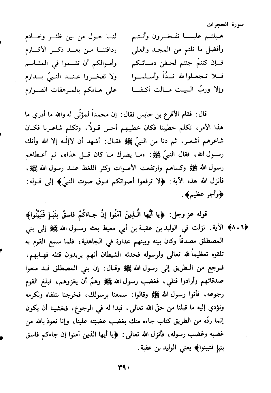 نَزَلَتْ فِي الْوَلِيدِ بْنِ عُقْبَةَ بْنِ أَبِي مُعَيْطٍ بَعَثَهُ رَسُولُ اللَّهِ - صَلَّى اللهُ عَلَيْهِ وَسَلَّمَ - إِلَى بَنِي الْمُصْطَلِقِ مُصَدِّقًا وَكَانَ بَيْنَهُ وَبَيْنَهُمْ عَدَاوَةٌ فِي الْجَاهِلِيَّةِ، فَلَمَّا سَمِعَ الْقَوْمُ بِهِ تَلَقَّوْهُ تَعْظِيمًا لِلَّهِ تَعَالَى وَلِرَسُولِهِ فَحَدَّثَهُ الشَّيْطَانُ أَنَّهُمْ يُرِيدُونَ قَتْلَهُ فَهَابَهُمْ، فَرَجَعَ مِنَ الطَّرِيقِ إِلَى رَسُولِ اللَّهِ - صَلَّى اللهُ عَلَيْهِ وَسَلَّمَ - وَقَالَ: إِنَّ بَنِي الْمُصْطَلِقِ قَدْ مَنَعُوا صَدَقَاتِهِمْ وَأَرَادُوا قَتْلِي، فَغَضِبَ رَسُولُ اللَّهِ - صَلَّى اللهُ عَلَيْهِ وَسَلَّمَ - وَهَمَّ أَنْ يَغْزُوَهُمْ، فَبَلَغَ الْقَوْمَ رُجُوعُهُ، فَأَتَوْا رَسُولَ اللَّهِ - صَلَّى اللهُ عَلَيْهِ وَسَلَّمَ - وَقَالُوا: سَمِعْنَا بِرَسُولِكَ، فَخَرَجْنَا نَتَلَقَّاهُ وَنُكْرِمُهُ وَنُؤَدِّي إِلَيْهِ مَا قَبِلْنَا مِنْ حَقِّ اللَّهِ تَعَالَى، فَبَدَا لَهُ فِي الرُّجُوعِ، فَخَشِينَا أَنْ يَكُونَ إِنَّمَا رَدَّهُ مِنَ الطَّرِيقِ كِتَابٌ جَاءَهُ مِنْكَ بِغَضَبٍ غَضِبْتَهُ عَلَيْنَا، وَإِنَّا نَعُوذُ بِاللَّهِ مِنْ غَضَبِهِ وَغَضَبِ رَسُولِهِ، فَأَنْزَلَ الله تعالى: {يَا أَيُّهَا الَّذِينَ آمَنُوا إِنْ جَاءَكُمْ فَاسِقٌ بِنَبَإٍ فَتَبَيَّنُوا} يَعْنِي الْوَلِيدَ بْنَ عُقْبَةَ.