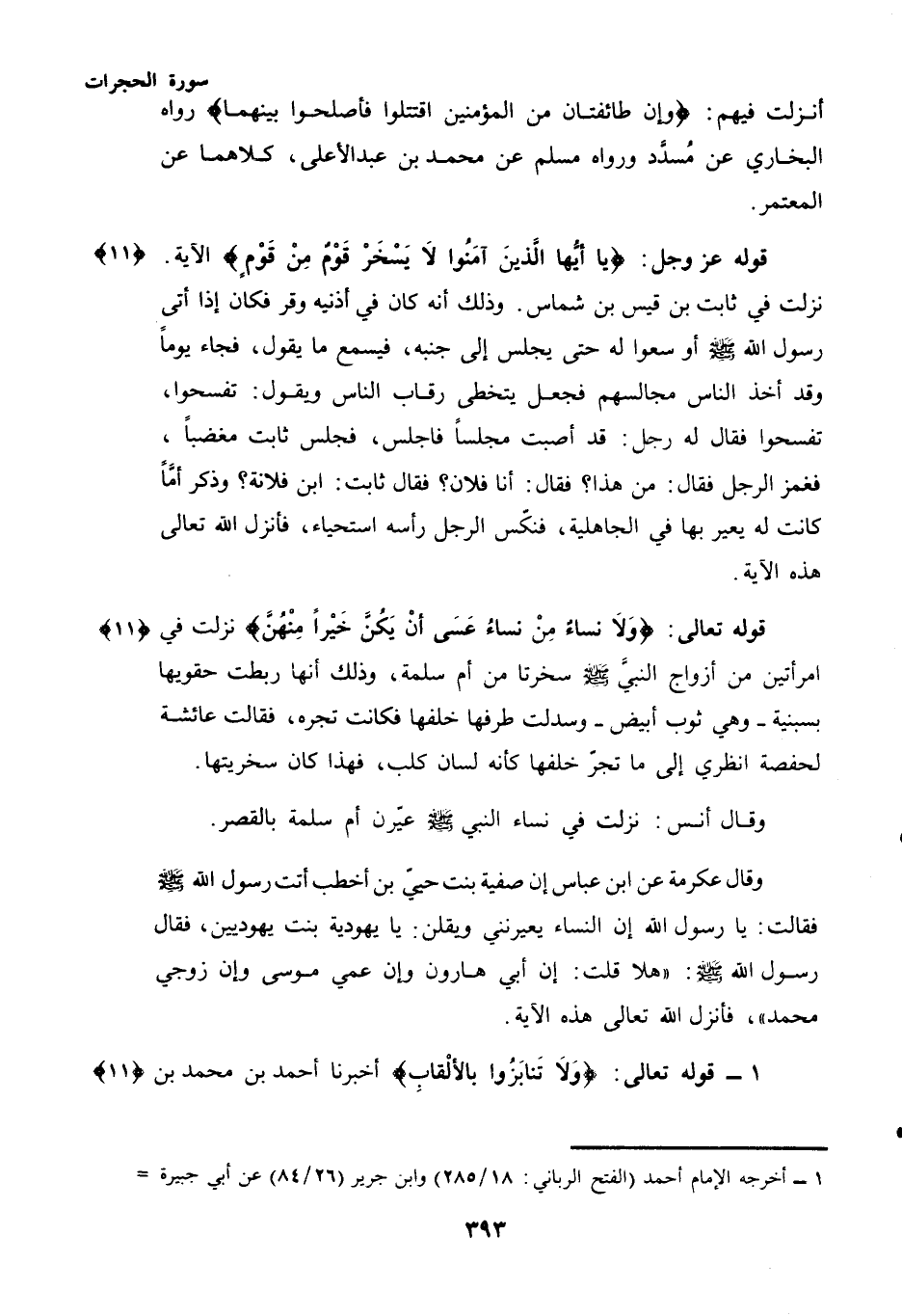 نَزَلَتْ فِي امْرَأَتَيْنِ مِنْ أَزْوَاجِ النَّبِيِّ - صَلَّى اللهُ عَلَيْهِ وَسَلَّمَ - سَخِرَتَا مِنْ أُمِّ سَلَمَةَ، وَذَلِكَ أَنَّهَا رَبَطَتْ حَقْوَيْهَا بِسَبَنِيَّةٍ - وَهِيَ ثَوْبٌ أَبْيَضُ - وَسَدَلَتْ طَرَفَهَا خَلْفَهَا فَكَانَتْ تَجُرُّهُ، فَقَالَتْ عَائِشَةُ لِحَفْصَةَ انْظُرِي إِلَى مَا تَجُرُّ خَلْفَهَا كَأَنَّهُ لِسَانُ كَلْبٍ، فَهَذَا كَانَ سُخْرِيَتَهَا. وَقَالَ أَنَسٌ: نَزَلَتْ فِي نِسَاءِ النَّبِيِّ - صَلَّى اللهُ عَلَيْهِ وَسَلَّمَ - عَيَّرْنَ أُمَّ سَلَمَةَ بِالْقِصَرِ. وَقَالَ عِكْرِمَةُ عَنِ ابْنِ عَبَّاسٍ إِنَّ صَفِيَّةَ بِنْتَ حُيَيِّ بْنِ أَخْطَبَ أَتَتْ رَسُولَ اللَّهِ - صَلَّى اللهُ عَلَيْهِ وَسَلَّمَ - فَقَالَتْ: يَا رَسُولَ اللَّهِ إِنَّ النِّسَاءَ يُعَيِّرْنَنِي وَيَقُلْنَ: يَا يَهُودِيَّةُ بِنْتَ يَهُودِيَّيْنِ، فَقَالَ رَسُولُ اللَّهِ - صَلَّى اللهُ عَلَيْهِ وَسَلَّمَ - "هَلَّا قُلْتِ: إِنَّ أَبِي هَارُونُ وَإِنَّ عَمِّي مُوسَى وَإِنَّ زَوْجِي مُحَمَّدٌ"، فَأَنْزَلَ اللَّهُ تَعَالَى هَذِهِ الْآيَةَ.