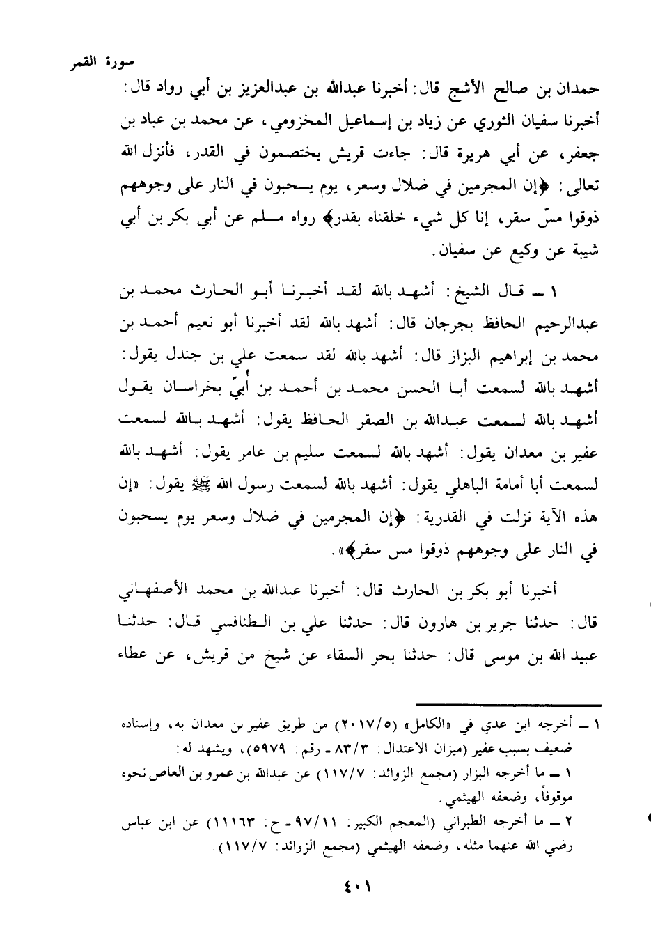 (¬1) - قَالَ الشَّيْخُ: أَشْهَدُ بِاللَّهِ لَقَدْ أَخْبَرَنَا أَبُو الْحَارِثِ مُحَمَّدُ بْنُ عَبْدِ الرَّحِيمِ الْحَافِظُ بِجُرْجَانَ قَالَ: أَشْهَدُ بِاللَّهِ لَقَدْ أَخْبَرَنَا أَبُو نُعَيْمٍ أَحْمَدُ بْنُ مُحَمَّدِ بْنِ إِبْرَاهِيمَ الْبَزَّازُ قَالَ: أَشْهَدُ بِاللَّهِ لَقَدْ سَمِعْتُ عَلِيَّ بْنَ جَنْدَلٍ يَقُولُ: أَشْهَدُ بِاللَّهِ لَسَمِعْتُ أَبَا الْحَسَنِ مُحَمَّدُ بْنُ أَحْمَدَ بْنِ أُبَيٍّ بِخُرَاسَانَ يَقُولُ أَشْهَدُ بِاللَّهِ لَسَمِعْتُ عَبْدَ اللَّهِ بْنَ الصَّقْرِ الْحَافِظَ يَقُولُ: أَشْهَدُ بِاللَّهِ لَسَمِعْتُ عُفَيْرَ بْنَ مَعْدَانَ يَقُولُ: أَشْهَدُ بِاللَّهِ لَسَمِعْتُ سُلَيْمَ بْنَ عَامِرٍ يَقُولُ: أَشْهَدُ بِاللَّهِ لَسَمِعْتُ أَبَا أُمَامَةَ الْبَاهِلِيُّ يَقُولُ: أَشْهَدُ بِاللَّهِ لَسَمِعْتُ رَسُولَ اللَّهِ - صَلَّى اللهُ عَلَيْهِ وَسَلَّمَ - يَقُولُ: "إِنَّ هَذِهِ الْآيَةَ نَزَلَتْ فِي الْقَدَرِيَّةِ: {إِنَّ الْمُجْرِمِينَ فِي ضَلَالٍ وَسُعُرٍ يَوْمَ يُسْحَبُونَ فِي النَّارِ عَلَى وُجُوهِهِمْ ذُوقُوا مَسَّ سَقَرَ}