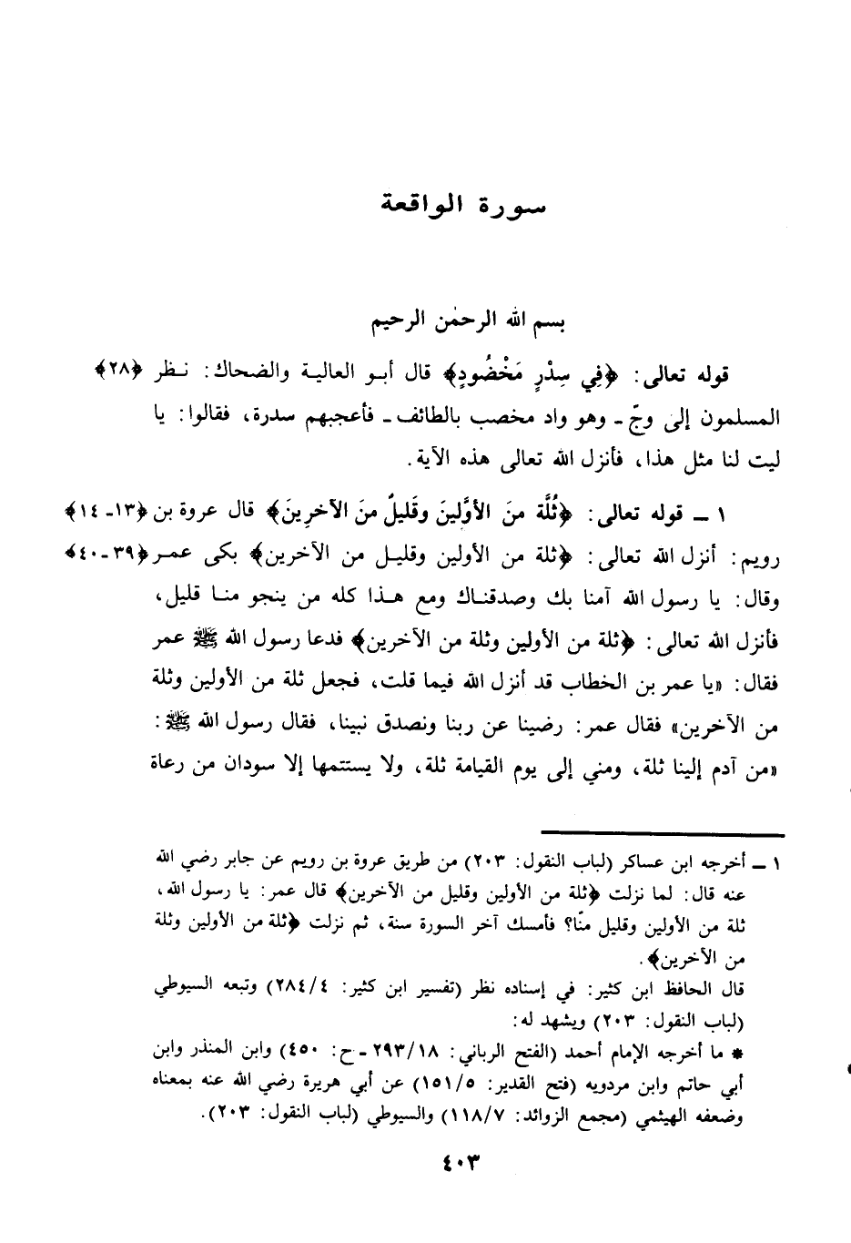 (¬1) 1 - أخرجه ابن عساكر (لباب النقول: 203) من طريق عروة بن رويم عن جابر رضي الله عنه قال: لما نزلت "ثلة من الأولين وقليل من الآخرين" قال عمر: يا رسول الله, ثلة من الأولين وقليل منا؟ فأمسك آخر السورة سنة, ثم نزلت (ثلة من الأولين وثلة من الآخرين) . قال الحافظ ابن كثير: في إسناده نظر (تفسير ابن كثير: 284 / 4) وتبعه السيوطي (لباب النقول: 203) ويشهد له: