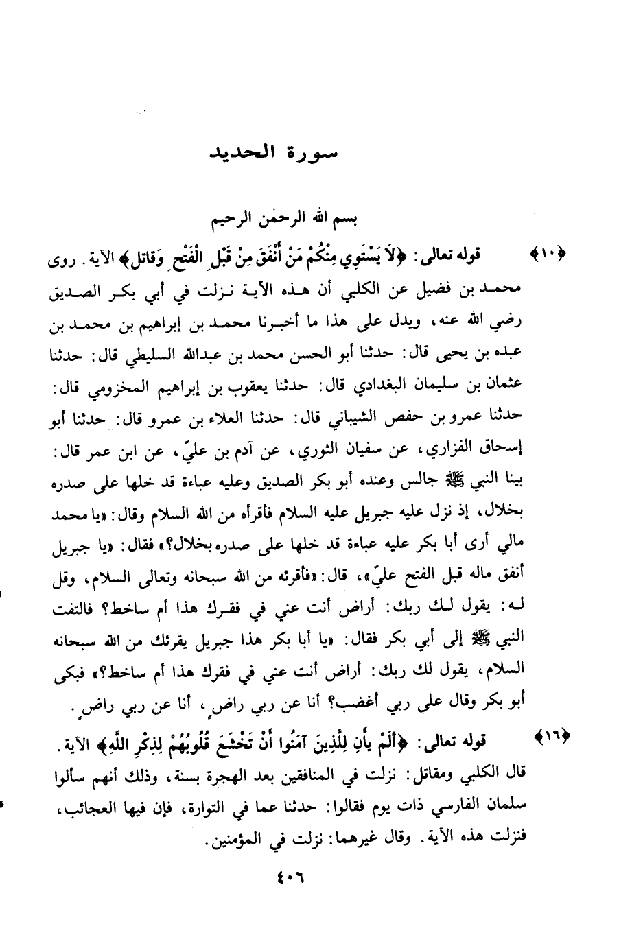 رَوَى مُحَمَّدُ بْنُ فُضَيْلٍ عَنِ الْكَلْبِيِّ أَنَّ هَذِهِ الْآيَةَ نَزَلَتْ فِي أَبِي بَكْرٍ الصِّدِّيقِ - رَضِيَ اللَّهُ عَنْهُ - وَيَدُلُّ عَلَى هَذَا مَا أَخْبَرَنَا مُحَمَّدُ بْنُ إِبْرَاهِيمَ بْنِ مُحَمَّدِ بْنِ عَبْدَةَ بْنِ يَحْيَى قَالَ: حَدَّثَنَا أَبُو الْحَسَنِ مُحَمَّدُ بْنُ عَبْدِ اللَّهِ السَّلِيطِيُّ قَالَ: حَدَّثَنَا عُثْمَانُ بْنُ سُلَيْمَانَ الْبَغْدَادِيُّ قَالَ: حَدَّثَنَا يَعْقُوبُ بْنُ إِبْرَاهِيمَ الْمَخْزُومِيُّ قَالَ: حَدَّثَنَا عَمْرُو بْنُ حَفْصٍ الشَّيْبَانِيُّ قَالَ: حَدَّثَنَا الْعَلَاءُ بْنُ عَمْرٍو قَالَ: حَدَّثَنَا أَبُو إِسْحَاقَ الْفَزَارِيُّ، عَنْ سُفْيَانَ الثَّوْرِيِّ، عَنْ آدَمَ بْنِ عَلِيٍّ، عَنِ ابْنِ عُمَرَ قَالَ: بَيْنَا النَّبِيُّ - صَلَّى اللهُ عَلَيْهِ وَسَلَّمَ - جَالِسٌ وَعِنْدَهُ أَبُو بَكْرٍ الصِّدِّيقُ وَعَلَيْهِ عباءة قد خلها عَلَى صَدْرِهِ بِخِلَالٍ، إِذْ نَزَلَ عَلَيْهِ جِبْرِيلُ عَلَيْهِ السَّلَامُ فَأَقْرَأَهُ مِنَ اللَّهِ السَّلَامَ وَقَالَ: "يا محمد مالي أَرَى أَبَا بَكْرٍ عَلَيْهِ عباءة قد خلها عَلَى صَدْرِهِ بِخِلَالٍ؟ " فَقَالَ: "يَا جِبْرِيلُ أَنْفَقَ مَالَهُ قَبْلَ الْفَتْحِ عَلَيَّ"، قَالَ: "فَأَقْرِئْهُ مِنَ اللَّهِ سُبْحَانَهُ وَتَعَالَى السَّلَامَ، وَقُلْ لَهُ: يَقُولُ لَكَ رَبُّكَ: أَرَاضٍ أَنْتَ عَنِّي فِي فَقْرِكَ هَذَا أَمْ سَاخِطٌ؟ فَالْتَفَتَ النَّبِيُّ - صَلَّى اللهُ عَلَيْهِ وَسَلَّمَ - إِلَى أَبِي بَكْرٍ فَقَالَ: "يَا أَبَا بَكْرٍ هَذَا جِبْرِيلُ يُقْرِئُكَ مِنَ اللَّهِ سُبْحَانَهُ السَّلَامَ، يَقُولُ لَكَ رَبُّكَ: أَرَاضٍ أَنْتَ عَنِّي فِي فَقْرِكَ هَذَا أَمْ سَاخِطٌ؟ " فَبَكَى أَبُو بَكْرٍ وَقَالَ عَلَى رَبِّي أَغْضَبُ؟ أَنَا عَنْ رَبِّي رَاضٍ، أَنَا عَنْ رَبِّي رَاضٍ.