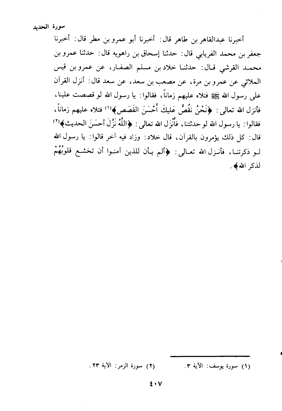 عَمْرُو بْنُ مُحَمَّدٍ الْقُرَشِيُّ قَالَ: حَدَّثَنَا خَلَّادُ بْنُ مُسْلِمٍ الصَّفَّارُ، عَنْ عَمْرِو بْنِ قَيْسٍ الْمُلَائِيِّ عَنْ عَمْرِو بْنِ مُرَّةَ، عَنْ مُصْعَبِ بْنِ سَعْدٍ، عَنْ سَعْدٍ قَالَ: أُنْزِلَ الْقُرْآنُ عَلَى رَسُولِ اللَّهِ - صَلَّى اللهُ عَلَيْهِ وَسَلَّمَ - فَتَلَاهُ عَلَيْهِمْ زَمَانًا، فَقَالُوا: يَا رَسُولَ اللَّهِ لَوْ قَصَصْتَ عَلَيْنَا، فَأَنْزَلَ اللَّهُ تَعَالَى: {نَحْنُ نَقُصُّ عَلَيْكَ أَحْسَنَ الْقَصَصِ} (¬1) فَتَلَاهُ عَلَيْهِمْ زَمَانًا، فَقَالُوا: يَا رَسُولَ اللَّهِ لَوْ حَدَّثَتْنَا، فَأَنْزَلَ اللَّهُ تَعَالَى: {اللَّهُ نَزَّلَ أَحْسَنَ الْحَدِيثِ} (¬2) قَالَ: كُلُّ ذَلِكَ يُؤْمَرُونَ بِالْقُرْآنِ، قَالَ خَلَّادٌ: وَزَادَ فِيهِ آخَرُ قَالُوا: يَا رَسُولَ اللَّهِ لَوْ ذَكَّرْتَنَا، فَأَنْزَلَ اللَّهُ تَعَالَى: {أَلَمْ يَأْنِ لِلَّذِينَ آمَنُوا أَنْ تَخْشَعَ قُلُوبُهُمْ لِذِكْرِ اللَّهِ} .