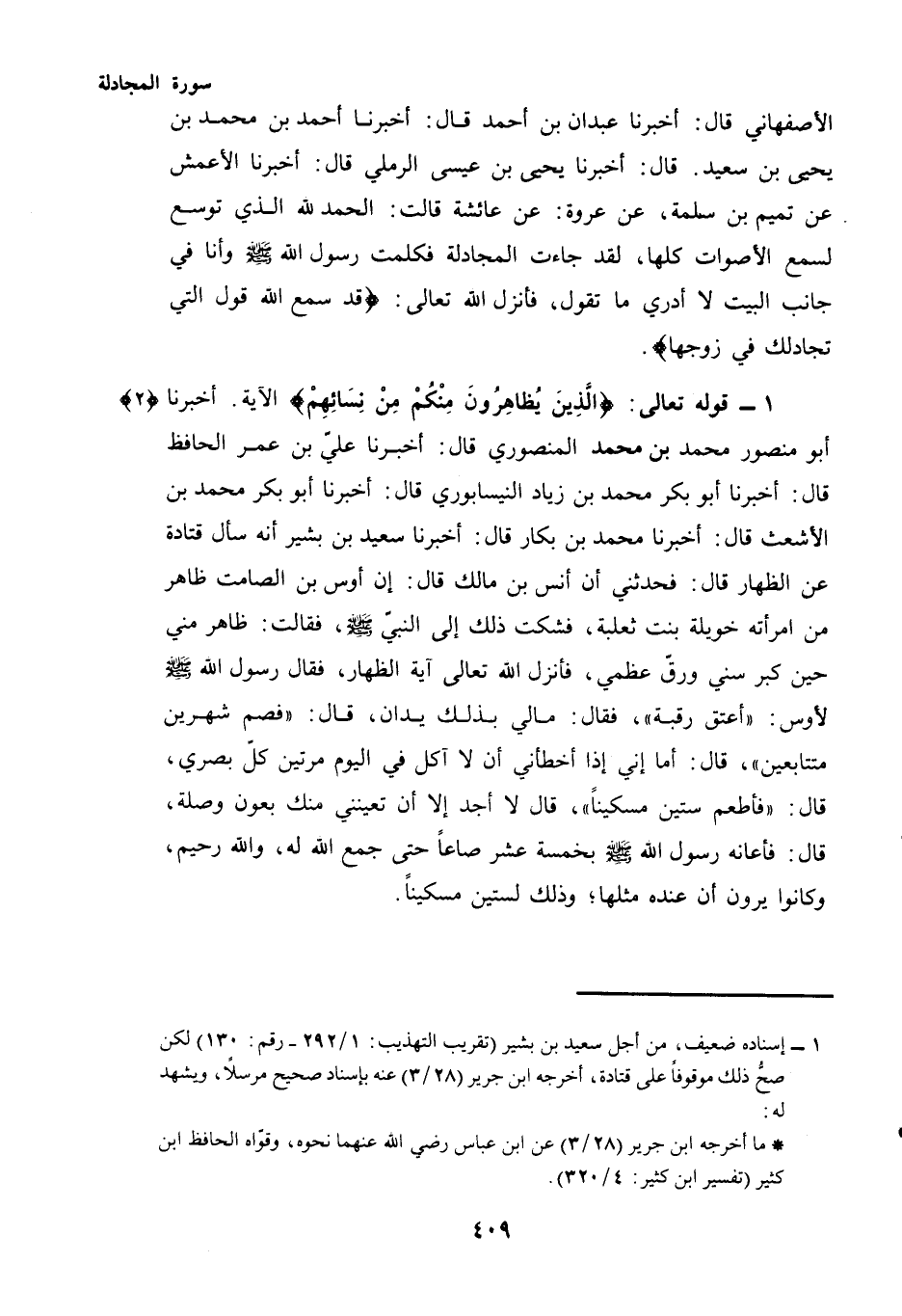 الأصفهاني قال: أخبرنا عَبْدَانُ بْنُ أحمد قال: أخبرنا أَحْمَدَ بْنُ مُحَمَّدِ بْنِ يَحْيَى بْنِ سعيد. قال: أخبرنا يَحْيَى بْنُ عِيسَى الرملي قال: أخبرنا الْأَعْمَشُ عَنْ تَمِيمِ بْنِ سَلَمَةَ، عَنْ عُرْوَةَ: عَنْ عَائِشَةَ قَالَتْ: الْحَمْدُ لِلَّهِ الَّذِي تَوَسَّعَ لِسَمْعِ الْأَصْوَاتِ كُلِّهَا، لَقَدْ جَاءَتِ الْمُجَادِلَةُ فَكَلَّمَتْ رَسُولَ اللَّهِ - صَلَّى اللهُ عَلَيْهِ وَسَلَّمَ - وَأَنَا فِي