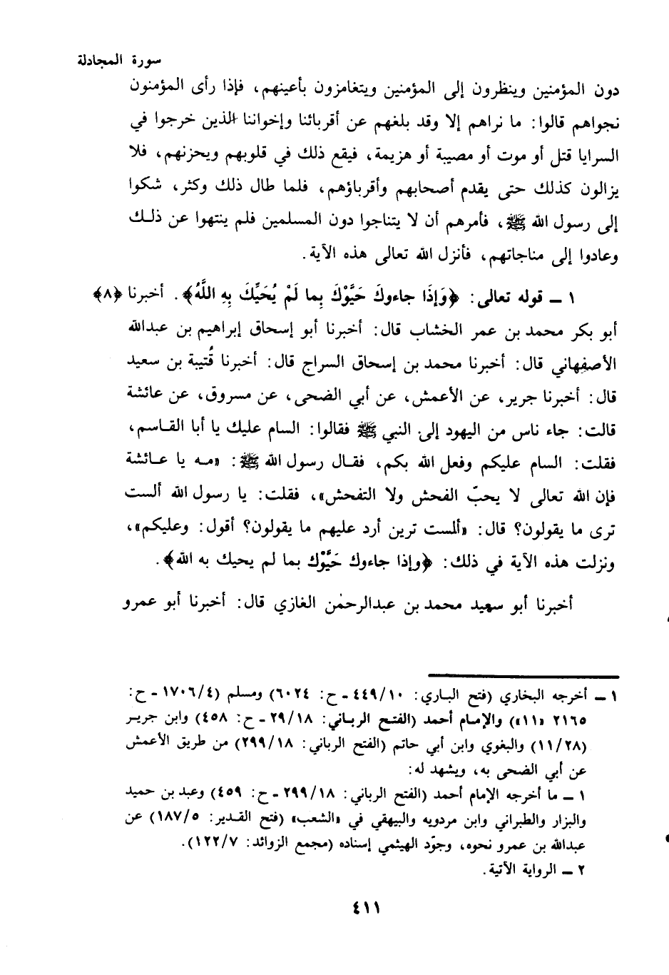 أَخْبَرَنَا أَبُو بَكْرٍ مُحَمَّدُ بْنُ عُمَرَ الْخَشَّابُ قَالَ: أَخْبَرَنَا أَبُو إِسْحَاقَ إِبْرَاهِيمُ بْنُ عَبْدِ اللَّهِ الْأَصْفَهَانِيُّ قَالَ: أَخْبَرَنَا مُحَمَّدُ بْنُ إِسْحَاقَ السراج قال: أخبرنا قُتَيْبَةُ بْنُ سعيد قال: أخبرنا جَرِيرٌ، عَنِ الْأَعْمَشِ، عَنْ أَبِي الضُّحَى، عَنْ مَسْرُوقٍ، عَنْ عَائِشَةَ قَالَتْ: جَاءَ نَاسٌ مَنِ الْيَهُودِ إِلَى النَّبِيِّ - صَلَّى اللهُ عَلَيْهِ وَسَلَّمَ - فَقَالُوا: السَّامُ عَلَيْكَ يَا أَبَا الْقَاسِمِ، فَقُلْتُ: السَّامُ عَلَيْكُمْ وَفَعَلَ اللَّهُ بِكُمْ، فَقَالَ رَسُولُ اللَّهِ - صَلَّى اللهُ عَلَيْهِ وَسَلَّمَ - "مَهْ يَا عَائِشَةُ فَإِنَّ اللَّهَ تَعَالَى لَا يُحِبُّ الْفُحْشَ وَلَا التَّفَحُّشَ"، فَقُلْتُ: يَا رَسُولَ اللَّهِ أَلَسْتَ تَرَى مَا يَقُولُونَ؟ قَالَ: "أَلَسْتِ تَرَيْنَ أَرُدُّ عَلَيْهِمْ مَا يَقُولُونَ؟ أَقُولُ: وَعَلَيْكُمْ"، وَنَزَلَتْ هَذِهِ الْآيَةُ فِي ذَلِكَ: {وَإِذَا جَاءُوكَ حَيَّوْكَ بِمَا لَمْ يُحَيِّكَ بِهِ اللَّهُ}