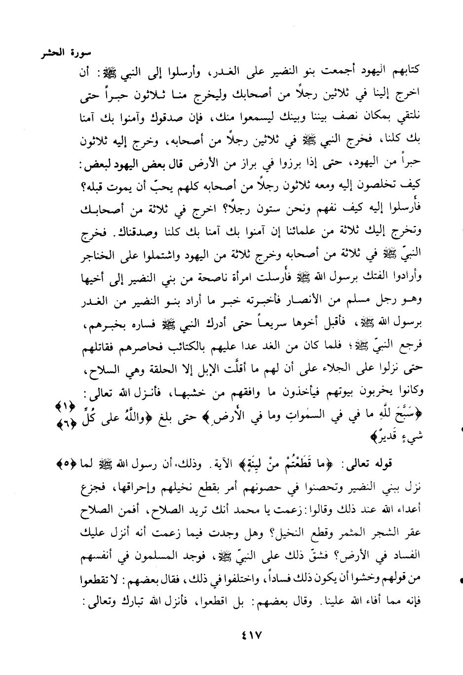 فِي ثَلَاثِينَ رَجُلًا مِنْ أَصْحَابِهِ، وَخَرَحَ إِلَيْهِ ثَلَاثُونَ حَبْرًا مِنَ الْيَهُودِ، حَتَّى إِذَا بَرَزُوا فِي بِرَازٍ مِنَ الْأَرْضِ قَالَ بَعْضُ الْيَهُودِ لِبَعْضٍ: كَيْفَ تَخْلُصُونَ إِلَيْهِ وَمَعَهُ ثَلَاثُونَ رَجُلًا مِنْ أَصْحَابِهِ كُلُّهُمْ يُحِبُّ أَنْ يَمُوتَ قَبْلَهُ؟ فَأَرْسَلُوا إِلَيْهِ كَيْفَ نَفْهَمُ وَنَحْنُ سِتُّونَ رَجُلًا؟ اخْرُجْ فِي ثَلَاثَةٍ مِنْ أَصْحَابِكَ وَنُخْرِجُ إِلَيْكَ ثَلَاثَةً مِنْ عُلَمَائِنَا إِنْ آمَنُوا بِكَ آمَنَّا بِكَ كلنا وصدقناك. فخرح النَّبِيُّ - صَلَّى اللهُ عَلَيْهِ وَسَلَّمَ - فِي ثَلَاثَةٍ مِنْ أَصْحَابِهِ وَخَرَجَ ثَلَاثَةٌ مِنَ الْيَهُودِ وَاشْتَمَلُوا عَلَى الْخَنَاجِرِ وَأَرَادُوا الْفَتْكَ بِرَسُولِ اللَّهِ - صَلَّى اللهُ عَلَيْهِ وَسَلَّمَ - فَأَرْسَلَتِ امْرَأَةٌ نَاصِحَةٌ مِنْ بَنِي النَّضِيرِ إِلَى أَخِيهَا وَهُوَ رَجُلٌ مُسْلِمٌ مِنَ الْأَنْصَارِ فَأَخْبَرَتْهُ خَبَرَ مَا أَرَادَ بَنُو النضير من الْغَدْرَ برسول الله - صَلَّى اللهُ عَلَيْهِ وَسَلَّمَ - فأقبل أخوها سريعًا حتى أدرك النبي - صَلَّى اللهُ عَلَيْهِ وَسَلَّمَ - فساره بخبرهم، فرجع النبي صَلَّى اللهُ عَلَيْهِ وَسَلَّمَ؛ فَلَمَّا كَانَ من الغد عدا عَلَيْهِمْ بالكتائب فحاصرهم فقاتلهم حَتَّى نَزَلُوا عَلَى الْجَلَاءِ عَلَى أَنَّ لَهُمْ مَا أَقَلَّتِ الْإِبِلُ إِلَّا الْحَلْقَةَ وَهِيَ السِّلَاحُ، وَكَانُوا يُخَرِّبُونَ بُيُوتَهُمْ فَيَأْخُذُونَ مَا وَافَقَهُمْ مِنْ خَشَبِهَا، فَأَنْزَلَ اللَّهُ تَعَالَى: {سَبَّحَ لِلَّهِ مَا فِي السَّمَاوَاتِ وَمَا فِي الْأَرْضِ} حَتَّى بَلَغَ {وَاللَّهُ عَلَى كُلِّ شَيْءٍ قَدِيرٌ}