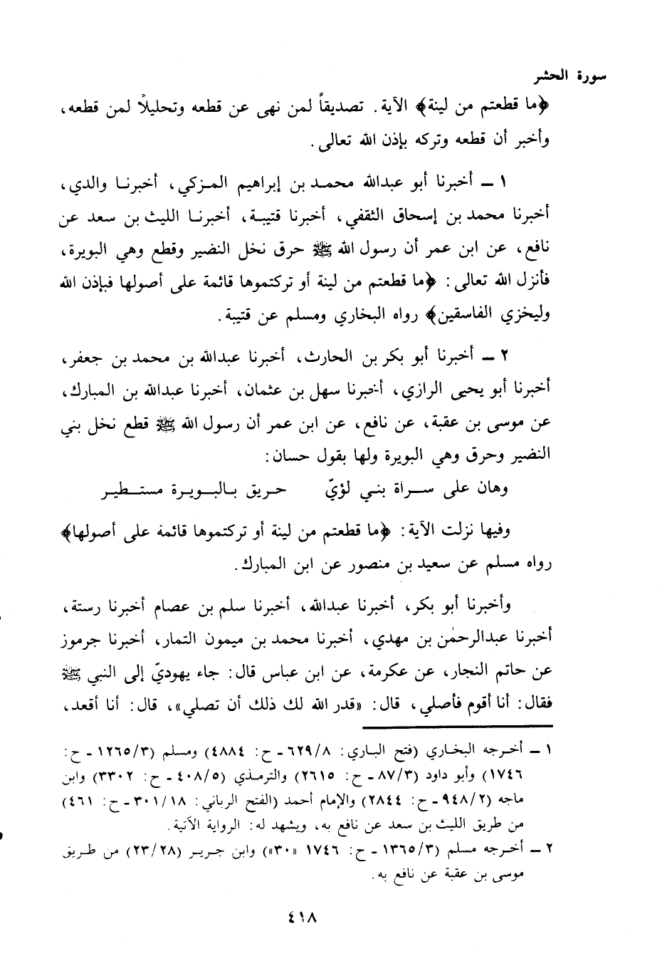 (¬1) - أَخْبَرَنَا أَبُو عَبْدِ اللَّهِ مُحَمَّدُ بْنُ إِبْرَاهِيمَ الْمُزَكِّي، أَخْبَرَنَا وَالِدِي، أَخْبَرَنَا مُحَمَّدُ بن إسحاق الثققي، أخبرنا قتيبة، أخبرنا اللَّيْثُ بْنُ سَعْدٍ عَنْ نَافِعٍ، عَنِ ابْنِ عُمَرَ أَنَّ رَسُولَ اللَّهِ - صَلَّى اللهُ عَلَيْهِ وَسَلَّمَ - حَرَقَ نَخْلَ النَّضِيرِ وَقَطَعَ وَهِيَ الْبُوَيْرَةُ، فَأَنْزَلَ اللَّهُ تَعَالَى: {مَا قَطَعْتُمْ مِنْ لِينَةٍ أَوْ تَرَكْتُمُوهَا قَائِمَةً عَلَى أُصُولِهَا فَبِإِذْنِ اللَّهِ وَلِيُخْزِيَ الْفَاسِقِينَ} رَوَاهُ الْبُخَارِيُّ وَمُسْلِمٌ عَنْ قُتَيْبَةَ.