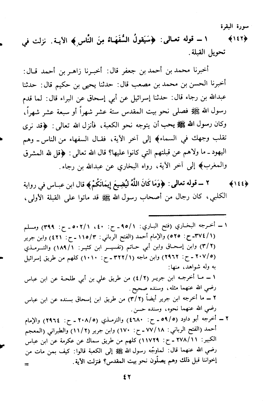 أَخْبَرَنَا مُحَمَّدُ بْنُ أَحْمَدَ بن جعفر قال: أَخْبَرَنَا زَاهِرُ بن أحمد قال: أَخْبَرَنَا الْحَسَنُ بْنُ مُحَمَّدِ بن مصعب قال: حَدَّثَنَا يَحْيَى بن حكيم قال: حَدَّثَنَا عَبْدُ اللَّهِ بْنُ رجاء قال: حَدَّثَنَا إِسْرَائِيلُ عَنْ أَبِي إِسْحَاقَ عَنِ الْبَرَاءِ قَالَ: لَمَّا قَدِمَ رَسُولُ اللَّهِ - صَلَّى اللهُ عَلَيْهِ وَسَلَّمَ - فَصَلَّى نَحْوَ بَيْتِ الْمَقْدِسِ سِتَّةَ عَشَرَ شَهْرًا أَوْ سَبْعَةَ عَشَرَ شَهْرًا وَكَانَ رَسُولُ اللَّهِ - صَلَّى اللهُ عَلَيْهِ وَسَلَّمَ - يُحِبُّ أَنْ يَتَوَجَّهَ نَحْوَ الْكَعْبَةِ، فَأَنْزَلَ اللَّهُ تَعَالَى: {قَدْ نَرَى تَقَلُّبَ وَجْهِكَ فِي السَّمَاءِ} إِلَى آخر الآية، فقال السُّفَهَاءُ مِنَ النَّاسِ - وَهُمُ الْيَهُودُ - مَا وَلَّاهُمْ عَنْ قِبْلَتِهِمُ الَّتِي كَانُوا عَلَيْهَا؟ قَالَ اللَّهُ تَعَالَى: {قُلْ لِلَّهِ الْمَشْرِقُ وَالْمَغْرِبُ} إِلَى آخِرِ الْآيَةِ، رَوَاهُ الْبُخَارِيُّ عَنْ عَبْدِ اللَّهِ بْنِ رَجَاءٍ.