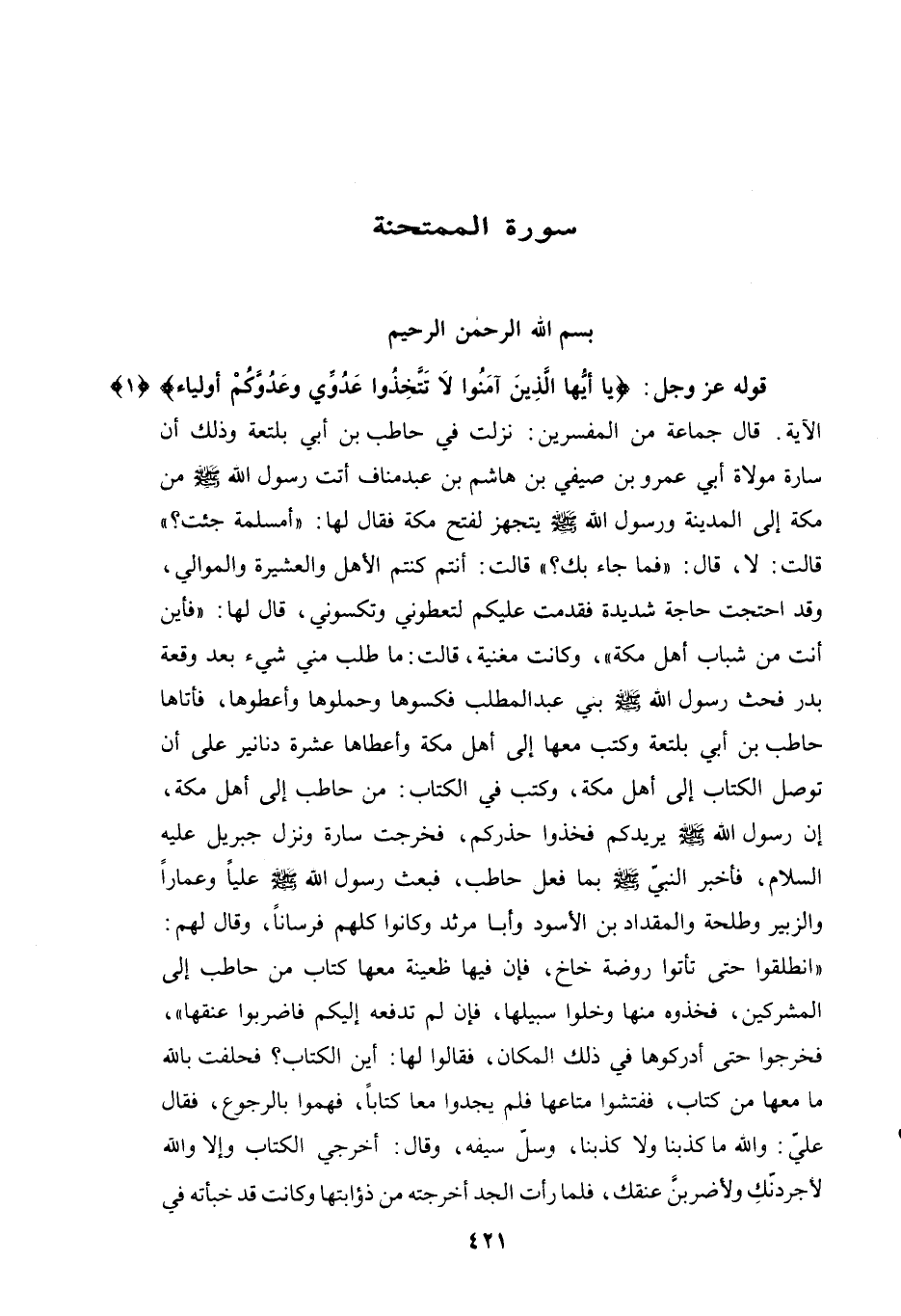 قَالَ جَمَاعَةٌ مِنَ الْمُفَسِّرِينَ: نَزَلَتْ فِي حَاطِبِ بْنِ أَبِي بَلْتَعَةَ وَذَلِكَ أَنَّ سَارَةَ مَوْلَاةَ أَبِي عَمْرِو بْنِ صَيْفِيِّ بْنِ هَاشِمِ بْنِ عَبْدِ مَنَافٍ أَتَتْ رَسُولَ اللَّهِ - صَلَّى اللهُ عَلَيْهِ وَسَلَّمَ - مِنْ مَكَّةَ إِلَى الْمَدِينَةِ وَرَسُولُ اللَّهِ - صَلَّى اللهُ عَلَيْهِ وَسَلَّمَ - يَتَجَهَّزُ لِفَتْحِ مَكَّةَ فَقَالَ لَهَا: "أَمُسْلِمَةً جِئْتِ؟ " قَالَتْ: لَا، قَالَ: "فَمَا جَاءَ بِكِ؟ " قَالَتْ: أَنْتُمْ كُنْتُمُ الْأَهْلَ وَالْعَشِيرَةَ وَالْمَوَالِيَ، وَقَدِ احْتَجْتُ حَاجَةً شَدِيدَةً فَقَدِمْتُ عَلَيْكُمْ لِتُعْطُونِي وَتَكْسُوَنِي، قَالَ لَهَا: "فَأَيْنَ أَنْتَ مِنْ شَبَابِ أَهْلِ مَكَّةَ"، وَكَانَتْ مُغَنِّيَةً، قَالَتْ: مَا طُلِبَ مِنِّي شَيْءٌ بَعْدَ وَقْعَةِ بَدْرٍ فَحَثَّ رَسُولُ اللَّهِ - صَلَّى اللهُ عَلَيْهِ وَسَلَّمَ - بَنِي عَبْدِ الْمُطَّلِبِ فَكَسَوْهَا وَحَمَلُوهَا وَأَعْطَوْهَا، فَأَتَاهَا حَاطِبُ بْنُ أَبِي بَلْتَعَةَ وَكَتَبَ مَعَهَا إِلَى أَهْلِ مَكَّةَ وَأَعْطَاهَا عَشَرَةَ دَنَانِيرَ عَلَى أَنْ تُوَصِّلَ الْكِتَابَ إِلَى أَهْلِ مَكَّةَ، وَكَتَبَ فِي الْكِتَابِ: مِنْ حَاطِبٍ إِلَى أَهْلِ مَكَّةَ، إِنَّ رَسُولَ اللَّهِ - صَلَّى اللهُ عَلَيْهِ وَسَلَّمَ - يُرِيدُكُمْ فَخُذُوا حِذْرَكُمْ، فَخَرَجَتْ سَارَةُ وَنَزَلَ جِبْرِيلُ عَلَيْهِ السَّلَامُ، فَأَخْبَرَ النَّبِيَّ - صَلَّى اللهُ عَلَيْهِ وَسَلَّمَ - بِمَا فَعَلَ حَاطِبٌ، فَبَعَثَ رَسُولُ اللَّهِ - صَلَّى اللهُ عَلَيْهِ وَسَلَّمَ - عَلِيًّا وَعَمَّارًا وَالزُّبَيْرَ وَطَلْحَةَ وَالْمِقْدَادَ بْنَ الْأَسْوَدِ وَأَبَا مَرْثَدٍ وَكَانُوا كُلُّهُمْ فُرْسَانًا، وَقَالَ لَهُمُ: "انْطَلِقُوا حَتَّى تَأْتُوا رَوْضَةَ خَاخٍ، فَإِنَّ فِيهَا ظَعِينَةً مَعَهَا كِتَابٌ مِنْ حَاطِبٍ إِلَى الْمُشْرِكِينَ، فَخُذُوهُ مِنْهَا وَخَلُّوا سَبِيلَهَا، فَإِنْ لَمْ تَدْفَعْهُ إِلَيْكُمْ فَاضْرِبُوا عُنُقَهَا"، فَخَرَجُوا حَتَّى أَدْرَكُوهَا فِي ذَلِكَ الْمَكَانِ، فَقَالُوا لَهَا: أَيْنَ الْكِتَابُ؟ فَحَلَفَتْ بِاللَّهِ مَا مَعَهَا مِنْ كِتَابٍ، فَفَتَّشُوا مَتَاعَهَا فلم يجدوا معا كِتَابًا، فَهَمُّوا بِالرُّجُوعِ، فَقَالَ عَلِيٌّ: وَاللَّهِ مَا كَذَبَنَا وَلَا كَذَّبْنَا، وَسَلَّ سَيْفَهُ، وَقَالَ: أَخْرِجِي الْكِتَابَ وَإِلَّا وَاللَّهِ لَأُجَرِّدَنَّكِ وَلَأَضْرِبَنَّ عُنُقَكِ، فَلَمَّا رَأَتِ الْجِدَّ أَخْرَجَتْهُ مِنْ ذُؤَابَتِهَا وَكَانَتْ قَدْ خَبَّأَتْهُ فِي