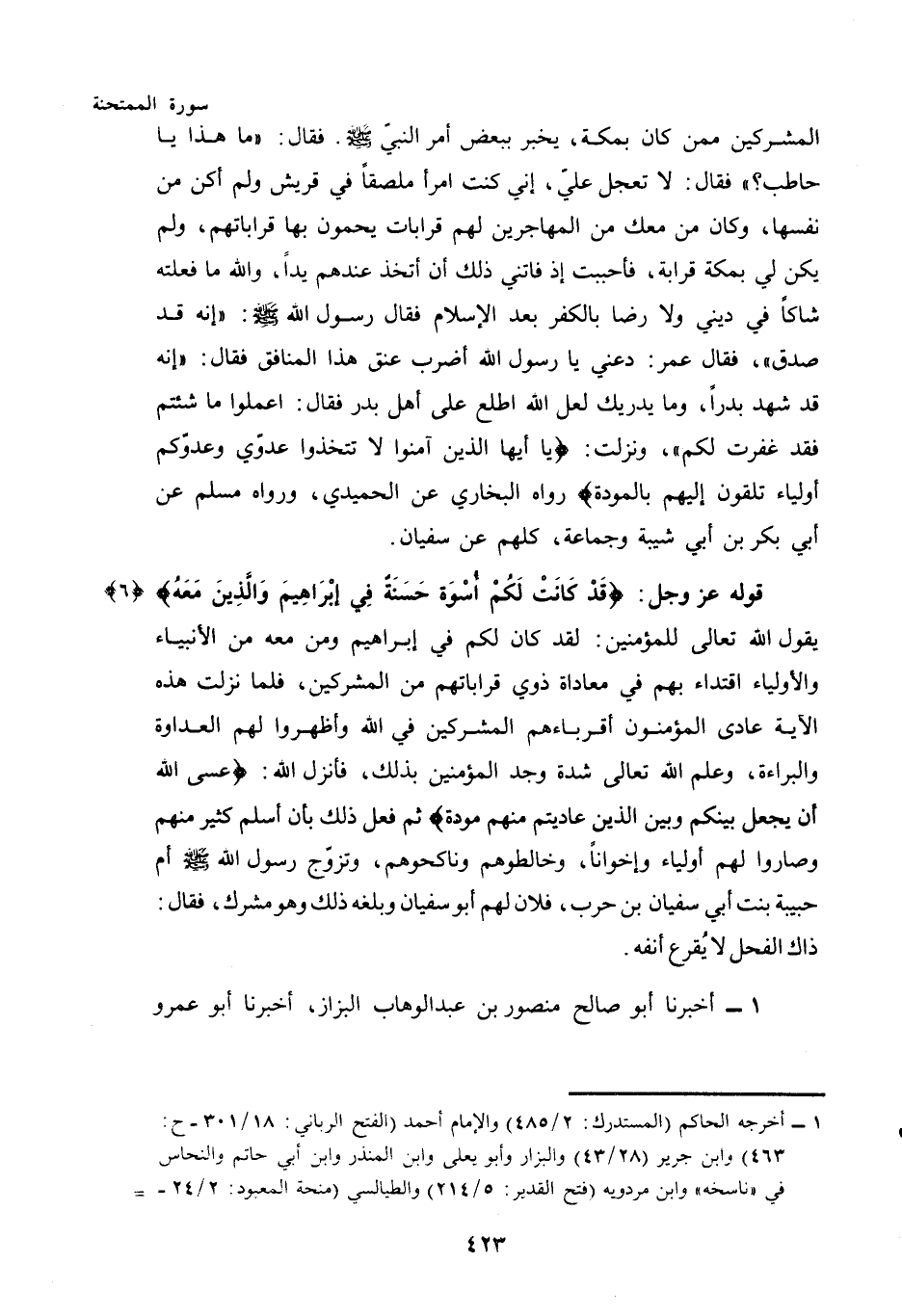مُلْصَقًا فِي قُرَيْشٍ وَلَمْ أَكُنْ مِنْ نَفْسِهَا، وَكَانَ مَنْ مَعَكَ مِنَ الْمُهَاجِرِينَ لَهُمْ قَرَابَاتٌ يَحْمُونَ بِهَا قَرَابَاتِهِمْ، وَلَمْ يَكُنْ لِي بِمَكَّةَ قَرَابَةٌ، فَأَحْبَبْتُ إِذْ فَاتَنِي ذَلِكَ أَنْ أَتَّخِذَ عِنْدَهُمْ يَدًا، وَاللَّهِ مَا فَعَلْتُهُ شَاكًّا فِي دِينِي وَلَا رِضًا بِالْكُفْرِ بَعْدَ الْإِسْلَامِ فَقَالَ رَسُولُ اللَّهِ - صَلَّى اللهُ عَلَيْهِ وَسَلَّمَ - "إِنَّهُ قَدْ صَدَقَ"، فَقَالَ عُمَرُ: دَعْنِي يَا رَسُولَ اللَّهِ أَضْرِبُ عُنُقَ هَذَا الْمُنَافِقِ فَقَالَ: "إِنَّهُ قَدْ شَهِدَ بَدْرًا، وَمَا يُدْرِيكَ لَعَلَّ اللَّهَ اطَّلَعَ عَلَى أَهْلِ بَدْرٍ فَقَالَ: اعْمَلُوا مَا شِئْتُمْ فَقَدْ غَفَرْتُ لَكُمْ"، وَنَزَلَتْ: {يَا أَيُّهَا الَّذِينَ آمَنُوا لَا تَتَّخِذُوا عَدُوِّي وَعَدُوَّكُمْ أَوْلِيَاءَ تُلْقُونَ إِلَيْهِمْ بِالْمَوَدَّةِ} رَوَاهُ الْبُخَارِيُّ عَنِ الْحُمَيْدِيِّ، وَرَوَاهُ مُسْلِمٌ عَنْ أَبِي بَكْرِ بْنِ أَبِي شَيْبَةَ وَجَمَاعَةٍ، كُلُّهُمْ عَنْ سفيان.