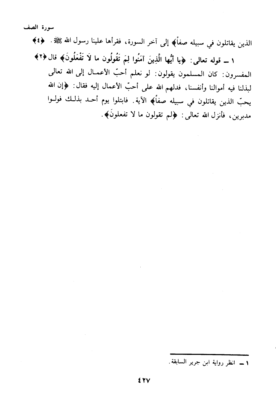 فِي سَبِيلِهِ صَفًّا} الْآيَةَ. فَابْتُلُوا يَوْمَ أُحُدٍ بِذَلِكَ فَوَلَّوْا مُدْبِرِينَ، فَأَنْزَلَ اللَّهُ تَعَالَى: {لِمَ تَقُولُونَ مَا لَا تَفْعَلُونَ} .
