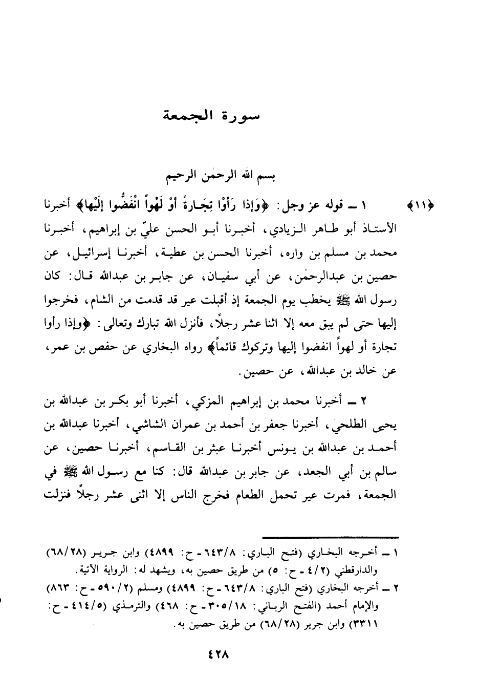 أَخْبَرَنَا الْأُسْتَاذُ أَبُو طَاهِرٍ الزِّيَادِيُّ، أَخْبَرَنَا أَبُو الْحَسَنِ عَلِيُّ بْنُ إِبْرَاهِيمَ، أَخْبَرَنَا مُحَمَّدُ بْنُ مُسْلِمِ بْنِ وَارَةَ، أَخْبَرَنَا الْحَسَنُ بن عطية، أخبرنا إِسْرَائِيلُ، عَنْ حُصَيْنِ بْنِ عَبْدِ الرَّحْمَنِ، عَنْ أَبِي سُفْيَانَ، عَنْ جَابِرِ بْنِ عَبْدِ اللَّهِ قَالَ: كَانَ رَسُولُ اللَّهِ - صَلَّى اللهُ عَلَيْهِ وَسَلَّمَ - يَخْطُبُ يَوْمَ الْجُمُعَةِ إِذْ أَقْبَلَتْ عِيرٌ قَدْ قَدِمَتْ مِنَ الشَّامِ، فَخَرَجُوا إِلَيْهَا حَتَّى لَمْ يَبْقَ مَعَهُ إِلَّا اثْنَا عَشَرَ رَجُلًا، فَأَنْزَلَ اللَّهُ تَبَارَكَ وَتَعَالَى: {وَإِذَا رَأَوْا تِجَارَةً أَوْ لَهْوًا انْفَضُّوا إِلَيْهَا وَتَرَكُوكَ قَائِمًا} رَوَاهُ الْبُخَارِيُّ عَنْ حَفْصِ بْنِ عُمَرَ، عَنْ خَالِدِ بْنِ عَبْدِ اللَّهِ، عَنْ حُصَيْنٍ.