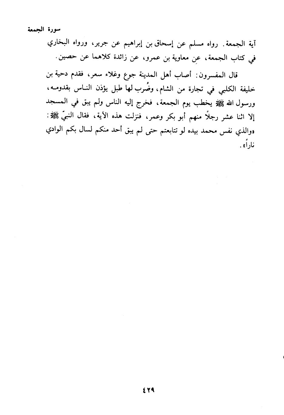 النَّاسُ وَلَمْ يَبْقَ فِي الْمَسْجِدِ إِلَّا اثْنَا عَشَرَ رَجُلًا مِنْهُمْ أَبُو بَكْرٍ وَعُمَرُ، فَنَزَلَتْ هَذِهِ الْآيَةُ، فَقَالَ النَّبِيُّ - صَلَّى اللهُ عَلَيْهِ وَسَلَّمَ - "وَالَّذِي نَفْسُ مُحَمَّدٍ بِيَدِهِ لَوْ تَتَابَعْتُمْ حَتَّى لَمْ يَبْقَ أَحَدٌ مِنْكُمْ لَسَالَ بِكُمُ الْوَادِي نَارًا".
