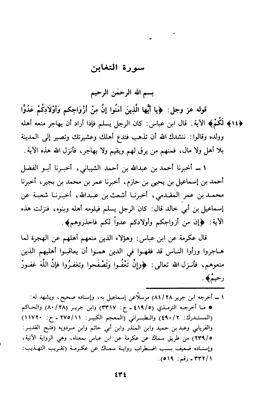 (¬1) - أَخْبَرَنَا أَحْمَدُ بْنُ عَبْدِ اللَّهِ بْنِ أحمد الشيباني، أخبرنا أَبُو الْفَضْلِ أَحْمَدُ بْنُ إِسْمَاعِيلَ بْنِ يَحْيَى بن حازم، أخبرنا عُمَرُ بْنُ مُحَمَّدِ بن بجير، أخبرنا مُحَمَّدُ بْنُ عمر المقدمي، أخبرنا أَشْعَثُ بْنُ عبد الله، أخبرنا شُعْبَةُ عَنْ إِسْمَاعِيلَ بْنِ أَبِي خَالِدٍ قَالَ: كَانَ الرَّجُلُ يُسْلِمُ فَيَلُومُهُ أَهْلُهُ وَبَنُوهُ، فَنَزَلَتْ هَذِهِ الْآيَةُ: {إِنَّ مِنْ أَزْوَاجِكُمْ وَأَوْلَادِكُمْ عَدُوًّا لَكُمْ فَاحْذَرُوهُمْ} قَالَ عِكْرِمَةُ عَنِ ابْنِ عَبَّاسٍ: وهؤلاء الَّذِينَ مَنَعَهُمْ أَهْلُهُمْ عَنِ الْهِجْرَةِ لَمَّا هَاجَرُوا وَرَأَوُا النَّاسَ قَدْ فَقِهُوا فِي الدِّينِ هَمُّوا أَنْ يُعَاقِبُوا أَهْلِيهِمُ الَّذِينَ مَنَعُوهُمْ، فَأَنْزَلَ اللَّهُ تَعَالَى: {وَإِنْ تَعْفُوا وَتَصْفَحُوا وَتَغْفِرُوا فَإِنَّ اللَّهَ غَفُورٌ رَحِيمٌ} .