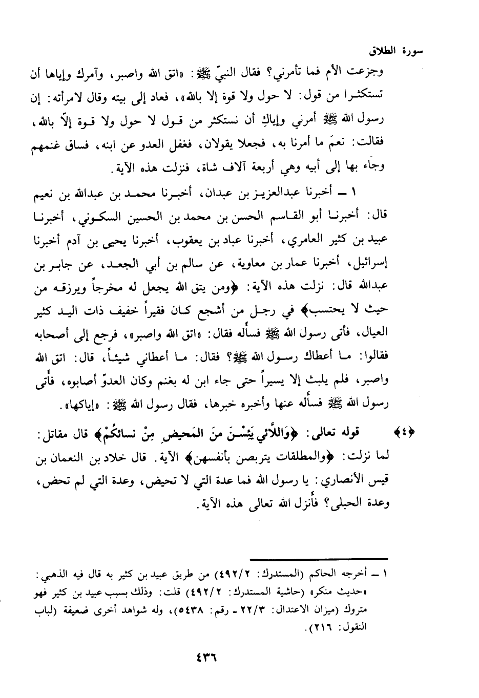 (¬1) - أَخْبَرَنَا عَبْدُ الْعَزِيزِ بْنُ عَبْدَانَ، أَخْبَرَنَا مُحَمَّدُ بْنُ عَبْدِ اللَّهِ بْنِ نُعَيْمٍ قَالَ: أَخْبَرَنَا أَبُو الْقَاسِمِ الْحَسَنُ بْنُ مُحَمَّدِ بْنِ الْحُسَيْنِ السكوني، أخبرنا عُبَيْدُ بْنُ كَثِيرٍ العامري، أخبرنا عَبَّادُ بْنُ يَعْقُوبَ، أَخْبَرَنَا يَحْيَى بن آدم أخبرنا إسرائيل، أخبرنا عَمَّارُ بْنُ مُعَاوِيَةَ، عَنْ سَالِمِ بْنِ أَبِي الْجَعْدِ، عَنْ جَابِرِ بْنِ عَبْدِ اللَّهِ قَالَ: نَزَلَتْ هَذِهِ الْآيَةُ: {وَمَنْ يَتَّقِ اللَّهَ يَجْعَلْ لَهُ مَخْرَجًا وَيَرْزُقْهُ مِنْ حَيْثُ لَا يَحْتَسِبُ} فِي رَجُلٍ مِنْ أَشْجَعَ كَانَ فَقِيرًا خَفِيفَ ذَاتِ الْيَدِ كَثِيرَ الْعِيَالِ، فَأَتَى رَسُولَ اللَّهِ - صَلَّى اللهُ عَلَيْهِ وَسَلَّمَ - فَسَأَلَهُ فَقَالَ: "اتَّقِ اللَّهَ وَاصْبِرْ"، فَرَجَعَ إِلَى أَصْحَابِهِ فَقَالُوا: مَا أَعْطَاكَ رَسُولُ اللَّهِ صَلَّى اللهُ عَلَيْهِ وَسَلَّمَ؟ فَقَالَ: مَا أَعْطَانِي شَيْئًا، قَالَ: اتَّقِ اللَّهَ وَاصْبِرْ، فَلَمْ يَلْبَثْ إِلَّا يَسِيرًا حَتَّى جَاءَ ابْنٌ لَهُ بِغَنَمٍ وَكَانَ الْعَدُوُّ أَصَابُوهُ، فَأَتَى رَسُولَ اللَّهِ - صَلَّى اللهُ عَلَيْهِ وَسَلَّمَ - فَسَأَلَهُ عَنْهَا وَأَخْبَرَهُ خَبَرَهَا، فَقَالَ رَسُولُ اللَّهِ - صَلَّى اللهُ عَلَيْهِ وَسَلَّمَ - "إِيَّاكَهَا".