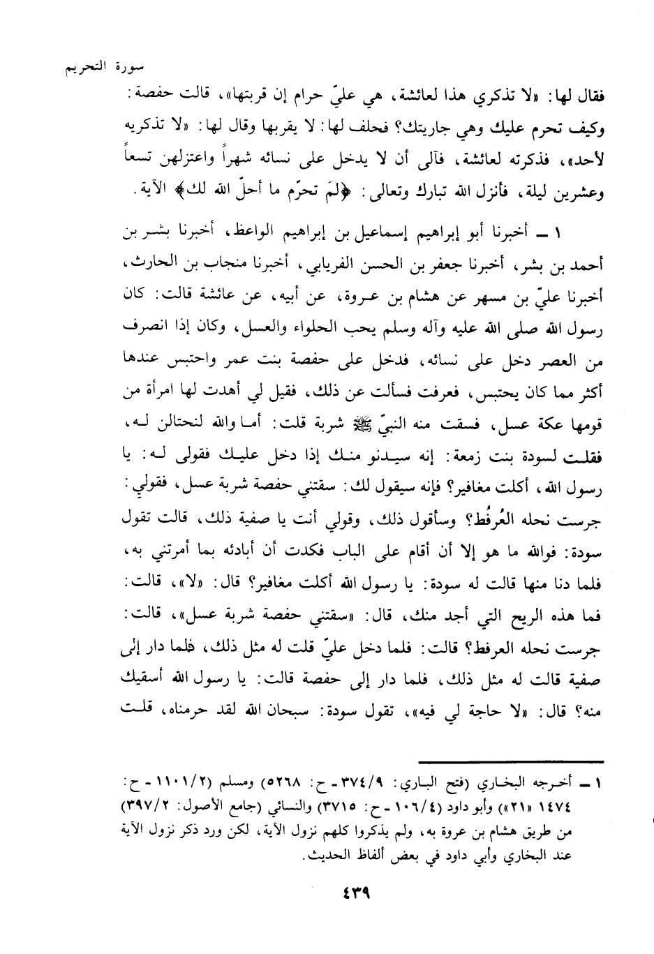 (¬1) - أَخْبَرَنَا أَبُو إِبْرَاهِيمَ إِسْمَاعِيلُ بْنُ إِبْرَاهِيمَ الْوَاعِظُ، أَخْبَرَنَا بِشْرُ بْنُ أَحْمَدَ بْنِ بِشْرٍ، أَخْبَرَنَا جَعْفَرُ بْنُ الحسن الفريابي، أخبرنا مِنْجَابُ بن الحارث، أخبرنا عَلِيُّ بْنُ مُسْهِرٍ عَنْ هِشَامِ بْنِ عُرْوَةَ، عَنْ أَبِيهِ، عَنْ عَائِشَةَ قَالَتْ: كَانَ رَسُولُ اللَّهِ صَلَّى اللهُ عَلَيْهِ وَآلِهِ وَسَلَّمَ يُحِبُّ الْحَلْوَاءَ وَالْعَسَلَ، وَكَانَ إِذَا انْصَرَفَ مِنَ الْعَصْرِ دَخَلَ عَلَى نِسَائِهِ، فَدَخَلَ عَلَى حَفْصَةَ بِنْتِ عُمَرَ وَاحْتَبَسَ عِنْدَهَا أَكْثَرَ مِمَّا كَانَ يَحْتَبِسُ، فَعَرَفْتُ فَسَأَلْتُ عَنْ ذَلِكَ، فَقِيلَ لِي أَهْدَتْ لَهَا امْرَأَةٌ مِنْ قَوْمِهَا عُكَّةَ عَسَلٍ، فَسَقَتْ مِنْهُ النَّبِيَّ - صَلَّى اللهُ عَلَيْهِ وَسَلَّمَ - شَرْبَةً قُلْتُ: أَمَا وَاللَّهِ لَنَحْتَالَنَّ لَهُ، فَقُلْتُ لِسَوْدَةَ بِنْتِ زَمْعَةَ: إِنَّهُ سَيَدْنُو مِنْكِ إِذَا دَخَلَ عَلَيْكِ فَقُولِي لَهُ: يَا رَسُولَ اللَّهِ، أَكَلْتَ مَغَافِيرَ؟ فَإِنَّهُ سَيَقُولُ لَكِ: سَقَتْنِي حَفْصَةُ شَرْبَةَ عَسَلٍ، فَقُولِي: جَرَسَتْ نَحْلُهُ الْعُرْفُطَ؟ وَسَأَقُولُ ذَلِكَ، وَقَوْلِي أَنْتِ يَا صَفِيَّةُ ذَلِكَ، قَالَتْ تَقُولُ سَوْدَةُ: فَوَاللَّهِ مَا هُوَ إِلَّا أَنْ أَقَامَ عَلَى الْبَابِ فَكِدْتُ أَنْ أُبَادِئَهُ بِمَا أَمَرَتْنِي بِهِ، فَلَمَّا دَنَا مِنْهَا قَالَتْ لَهُ سَوْدَةُ: يَا رَسُولَ اللَّهِ أَكَلْتَ مَغَافِيرَ؟ قَالَ: "لَا"، قَالَتْ: فَمَا هَذِهِ الرِّيحُ الَّتِي أَجِدُ مِنْكَ، قَالَ: "سَقَتْنِي حَفْصَةُ شَرْبَةَ عَسَلٍ"، قَالَتْ: جَرَسَتْ نَحْلُهُ الْعُرْفُطَ؟ قَالَتْ: فَلَمَّا دَخَلَ عَلَيَّ قُلْتُ لَهُ مِثْلَ ذَلِكَ، فَلَمَّا دَارَ إِلَى صَفِيَّةَ قَالَتْ لَهُ مِثْلَ ذَلِكَ، فَلَمَّا دَارَ إِلَى حَفْصَةَ قَالَتْ: يَا رَسُولَ اللَّهِ أَسْقِيكَ مِنْهُ؟ قَالَ: "لَا حَاجَةَ لِي فِيهِ"، تَقُولُ سَوْدَةُ: سُبْحَانَ اللَّهِ لَقَدْ حَرَمْنَاهُ، قُلْتُ