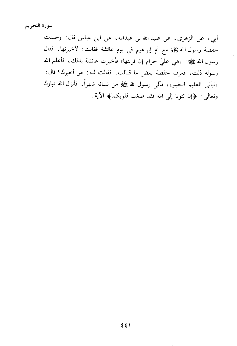 اللَّهِ - صَلَّى اللهُ عَلَيْهِ وَسَلَّمَ - "هِيَ عَلَيَّ حَرَامٌ إِنْ قَرِبْتُهَا" فَأَخْبَرَتْ عَائِشَةَ بِذَلِكَ، فَأَعْلَمَ اللَّهُ رَسُولَهُ ذَلِكَ، فَعَرَّفَ حَفْصَةَ بَعْضَ مَا قَالَتْ: فَقَالَتْ لَهُ: مَنْ أَخْبَرَكَ؟ قَالَ: {نَبَّأَنِيَ الْعَلِيمُ الْخَبِيرُ} فَآلَى رَسُولُ اللَّهِ - صَلَّى اللهُ عَلَيْهِ وَسَلَّمَ - مِنْ نِسَائِهِ شَهْرًا، فَأَنْزَلَ اللَّهُ تَبَارَكَ وَتَعَالَى: {إِنْ تَتُوبَا إِلَى اللَّهِ فَقَدْ صَغَتْ قُلُوبُكُمَا} الْآيَةَ.