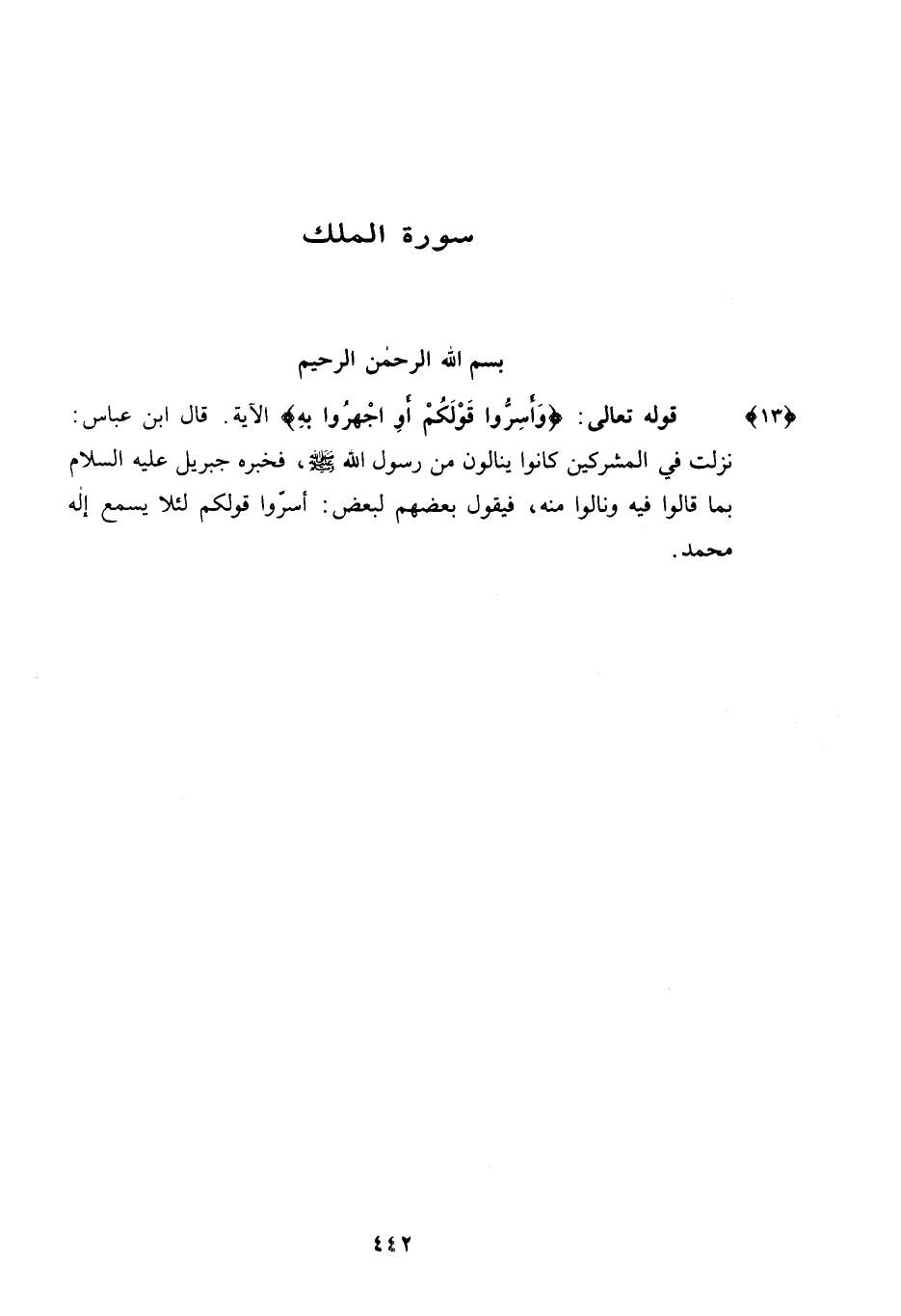 قَالَ ابْنُ عَبَّاسٍ: نَزَلَتْ فِي الْمُشْرِكِينَ كَانُوا يَنَالُونَ مِنْ رَسُولِ اللَّهِ - صَلَّى اللهُ عَلَيْهِ وَسَلَّمَ - فَخَبَّرَهُ جِبْرِيلُ عَلَيْهِ السَّلَامُ بِمَا قَالُوا فِيهِ وَنَالُوا مِنْهُ، فَيَقُولُ بَعْضُهُمْ لِبَعْضٍ: أَسِرُّوا قَوْلَكُمْ لِئَلَّا يَسْمَعَ إِلَهُ مُحَمَّدٍ.