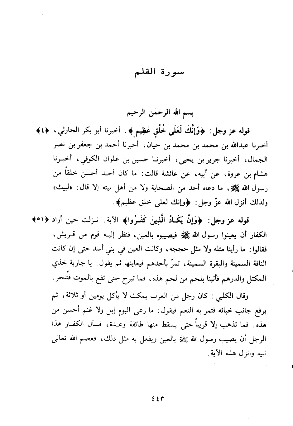 نَزَلَتْ حِينَ أَرَادَ الْكُفَّارُ أَنْ يَعِينُوا رَسُولَ اللَّهِ - صَلَّى اللهُ عَلَيْهِ وَسَلَّمَ - فَيُصِيبُوهُ بِالْعَيْنِ، فَنَظَرَ إِلَيْهِ قَوْمٌ مِنْ قُرَيْشٍ، فَقَالُوا: مَا رَأَيْنَا مِثْلَهُ وَلَا مِثْلَ حُجَجِهِ، وَكَانَتِ الْعَيْنُ فِي بَنِي أَسَدٍ حَتَّى إِنْ كَانَتِ النَّاقَةُ السَّمِينَةُ وَالْبَقَرَةُ السَّمِينَةُ، تَمُرُّ بِأَحَدِهِمْ فَيُعَايِنُهَا ثُمَّ يَقُولُ: يَا جَارِيَةُ خُذِي الْمِكْتَلَ وَالدِّرْهَمَ فَأْتِينَا بِلَحْمٍ مِنْ لَحْمِ هَذِهِ، فَمَا تَبْرَحُ حَتَّى تَقَعَ بِالْمَوْتِ فَتُنْحَرَ.