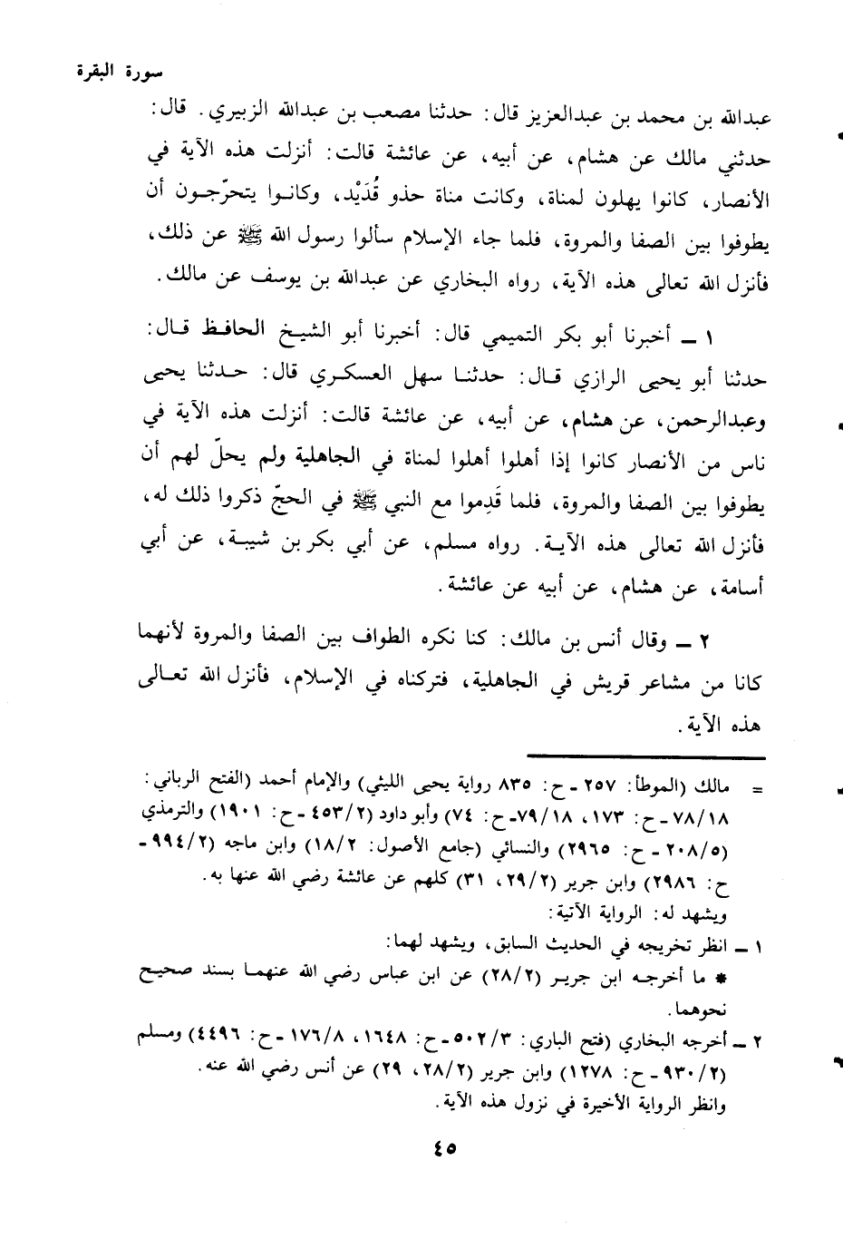 عَبْدُ اللَّهِ بْنُ مُحَمَّدِ بْنِ عبد العزيز قال. حدثنا مُصْعَبُ بْنُ عَبْدِ الله الزبيري. قال: حدثني مَالِكٌ، عَنْ هِشَامٍ، عَنْ أَبِيهِ، عَنْ عَائِشَةَ قَالَتْ: أُنْزِلَتْ هَذِهِ الْآيَةُ فِي الأنصار، كانوا يهلون لِمَنَاةَ، وَكَانَتْ مَنَاةُ حَذْوَ قُدَيْدٍ، وَكَانُوا يَتَحَرَّجُونَ أَنْ يَطُوفُوا بَيْنَ الصَّفَا وَالْمَرْوَةِ، فَلَمَّا جَاءَ الْإِسْلَامُ سَأَلُوا رَسُولَ اللَّهِ - صَلَّى اللهُ عَلَيْهِ وَسَلَّمَ - عَنْ ذَلِكَ، فَأَنْزَلَ اللَّهُ تَعَالَى هَذِهِ الْآيَةَ، رَوَاهُ الْبُخَارِيُّ عَنْ عَبْدِ اللَّهِ بْنِ يُوسُفَ عَنْ مَالِكٍ.
