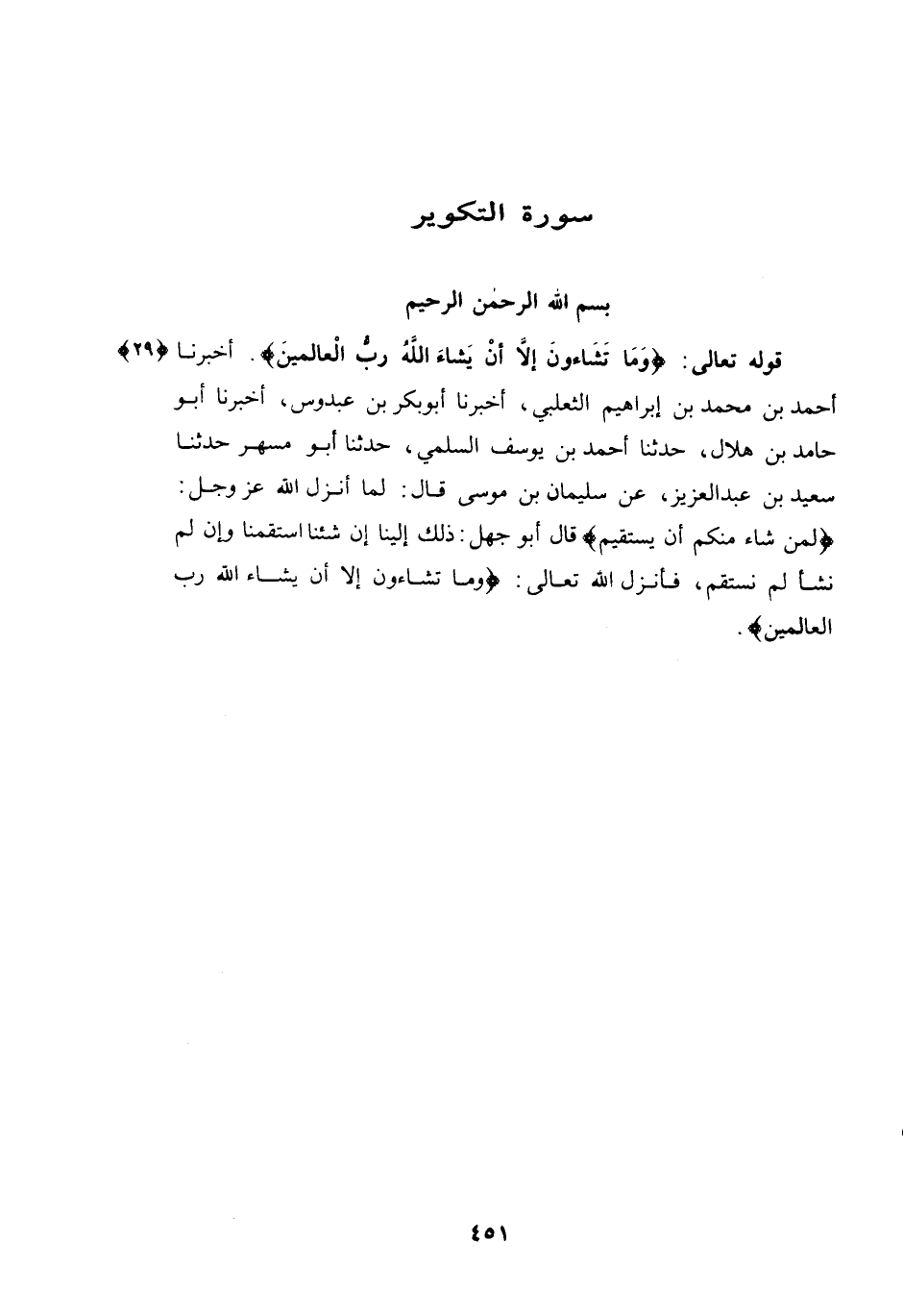 أَخْبَرَنَا أَحْمَدُ بْنُ مُحَمَّدِ بْنِ إِبْرَاهِيمَ الثَّعْلَبِيُّ، أَخْبَرَنَا أَبُو بَكْرِ بْنُ عَبْدُوسٍ، أَخْبَرَنَا أَبُو حَامِدِ بْنِ هِلَالٍ، حَدَّثَنَا أَحْمَدُ بْنُ يُوسُفَ السُّلَمِيُّ، حَدَّثَنَا أَبُو مُسْهِرٍ حَدَّثَنَا سَعِيدُ بْنُ عَبْدِ الْعَزِيزِ، عَنْ سُلَيْمَانَ بْنِ مُوسَى قَالَ: لَمَّا أَنْزَلَ اللَّهُ - عَزَّ وَجَلَّ - {لِمَنْ شَاءَ مِنْكُمْ أَنْ يَسْتَقِيمَ} قَالَ أَبُو جَهْلٍ: ذَلِكَ إِلَيْنَا إِنْ شِئْنَا اسْتَقَمْنَا وَإِنْ لَمْ نَشَأْ لَمْ نَسْتَقِمْ، فَأَنْزَلَ اللَّهُ تَعَالَى: {وَمَا تَشَاءُونَ إِلَّا أَنْ يَشَاءَ اللَّهُ رَبُّ الْعَالَمِينَ} .
