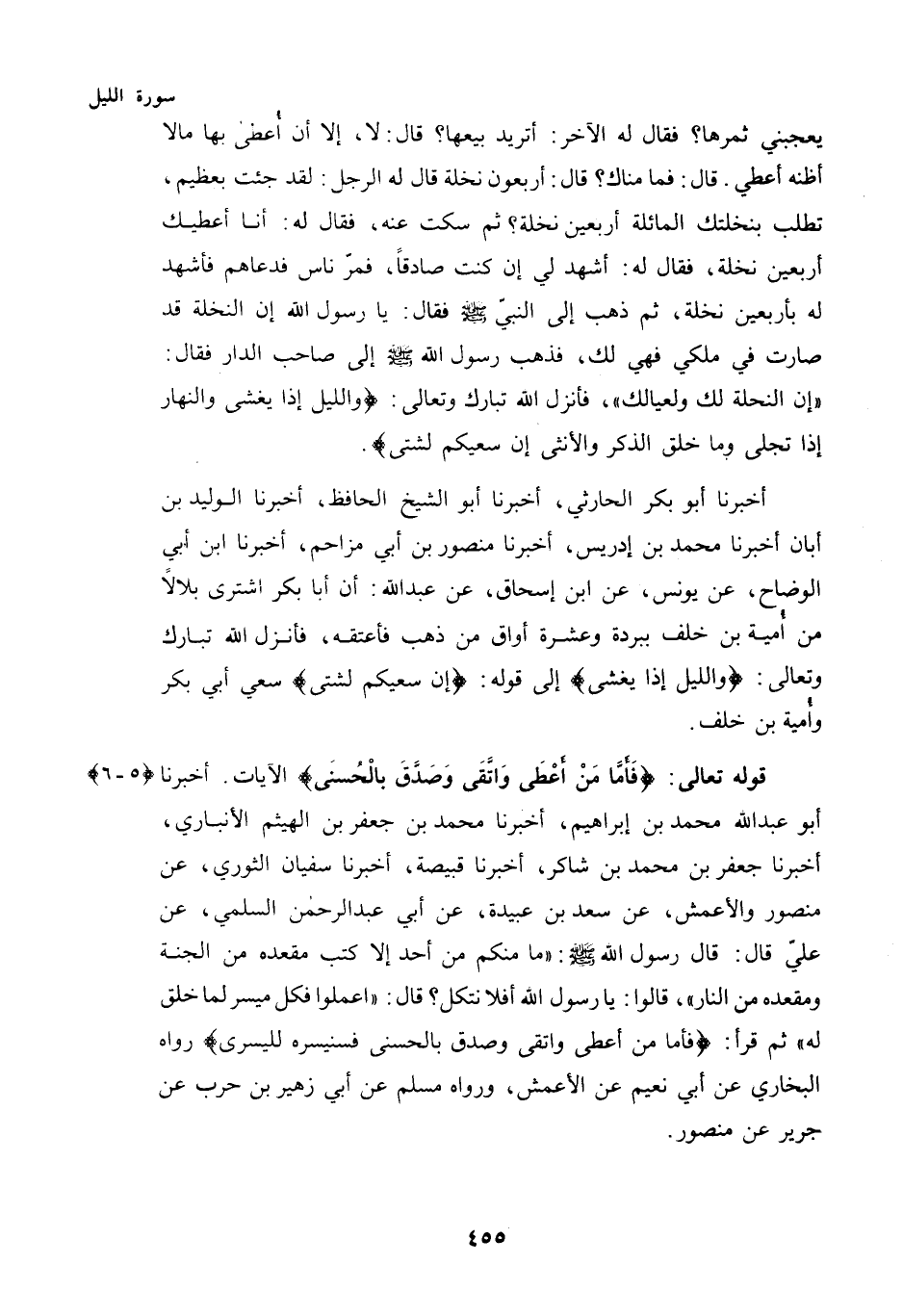 فَأَشْهَدَ لَهُ بِأَرْبَعِينَ نَخْلَةً، ثُمَّ ذَهَبَ إِلَى النَّبِيِّ - صَلَّى اللهُ عَلَيْهِ وَسَلَّمَ - فَقَالَ: يَا رَسُولَ اللَّهِ إِنَّ النَّخْلَةَ قَدْ صَارَتْ فِي مِلْكِي فَهِيَ لَكَ، فَذَهَبَ رَسُولُ اللَّهِ - صَلَّى اللهُ عَلَيْهِ وَسَلَّمَ - إِلَى صَاحِبِ الدَّارِ فَقَالَ: "إِنَّ النَّحْلَةَ لَكَ وَلِعِيَالِكَ"، فَأَنْزَلَ اللَّهُ تَبَارَكَ وَتَعَالَى: {وَاللَّيْلِ إِذَا يَغْشَى وَالنَّهَارِ إِذَا تَجَلَّى وَمَا خَلَقَ الذَّكَرَ وَالْأُنْثَى إِنَّ سَعْيَكُمْ لَشَتَّى}