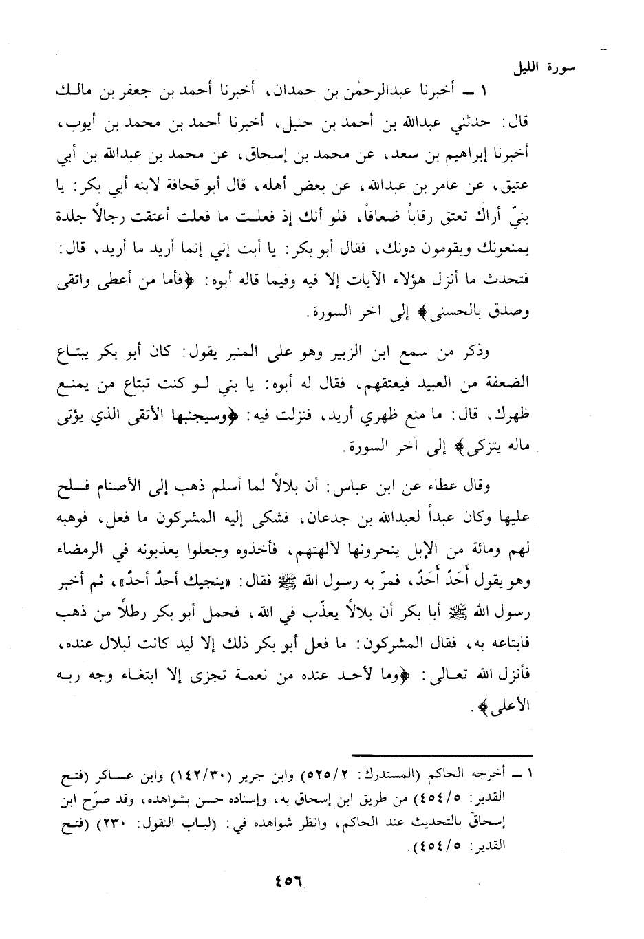 (¬1) - أَخْبَرَنَا عَبْدُ الرَّحْمَنِ بْنُ حَمْدَانَ، أَخْبَرَنَا أَحْمَدُ بْنُ جَعْفَرِ بْنِ مَالِكٍ قَالَ: حَدَّثَنِي عَبْدُ اللَّهِ بْنُ أَحْمَدَ بن حنبل، أخبرنا أَحْمَدُ بْنُ مُحَمَّدِ بن أيوب، أخبرنا إِبْرَاهِيمُ بْنُ سَعْدٍ، عَنْ مُحَمَّدِ بْنِ إِسْحَاقَ، عَنْ مُحَمَّدِ بْنِ عَبْدِ اللَّهِ بن أَبِي عَتِيقٍ، عَنْ عَامِرِ بْنِ عَبْدِ اللَّهِ، عَنْ بَعْضِ أَهْلِهِ، قَالَ أَبُو قُحَافَةَ لِابْنِهِ أَبِي بَكْرٍ: يَا بُنَيَّ أَرَاكَ تَعْتِقُ رِقَابًا ضِعَافًا، فَلَوْ أَنَّكَ إِذْ فَعَلْتَ مَا فَعَلْتَ أَعْتَقْتَ رِجَالًا جَلَدَةً يَمْنَعُونَكَ وَيَقُومُونَ دُونَكَ، فَقَالَ أَبُو بَكْرٍ: يَا أَبَتِ إِنِّي إِنَّمَا أريد ما أُرِيدُ، قَالَ: فتحدث ما أنزل هَؤُلَاءِ الْآيَاتُ إِلَّا فِيهِ وَفِيمَا قَالَهُ أَبُوهُ: {فَأَمَّا مَنْ أَعْطَى وَاتَّقَى وَصَدَّقَ بِالْحُسْنَى} إِلَى آخِرِ السُّورَةِ.